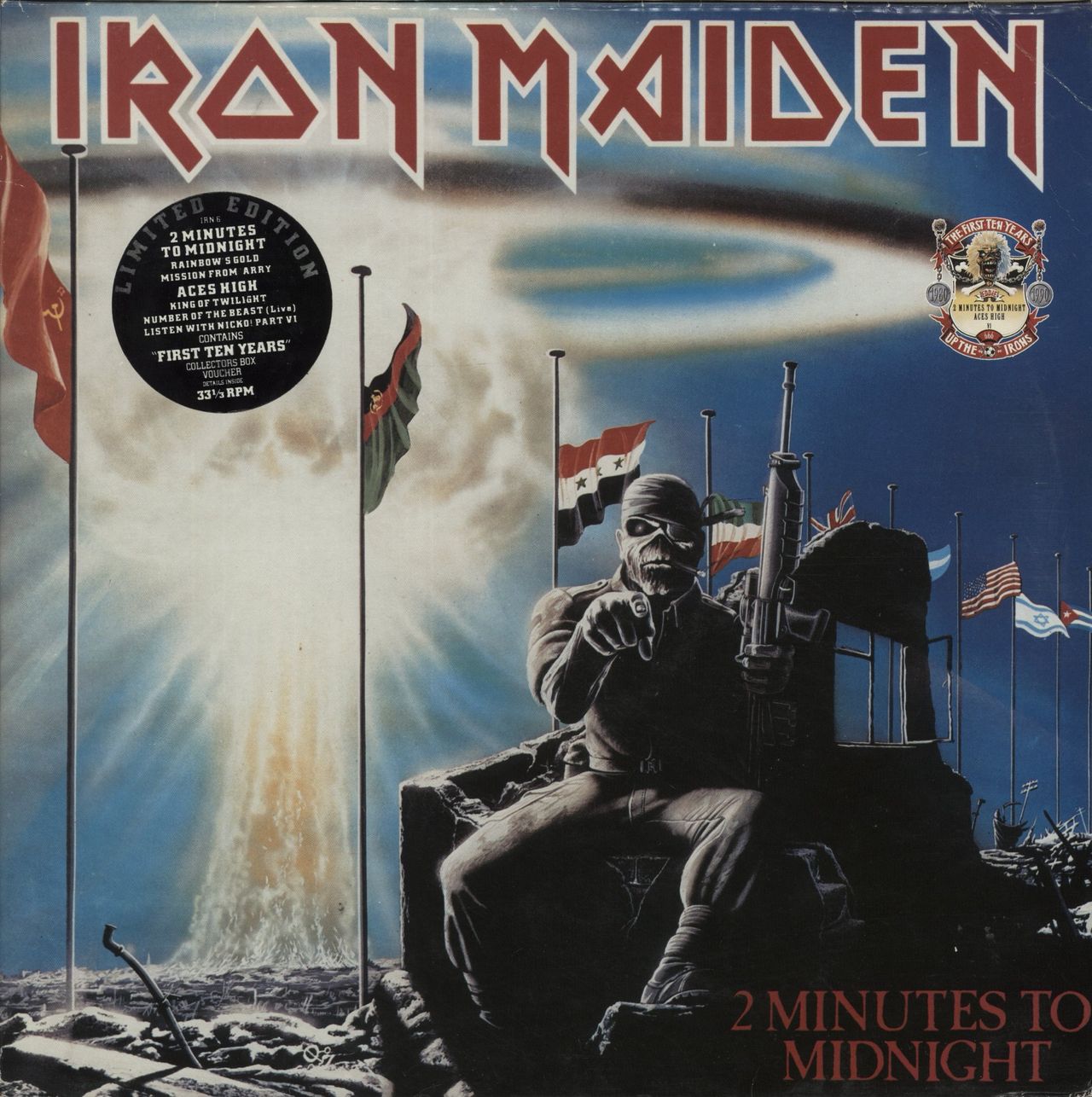 IRON MAIDEN 2 Minutes To Midnight / Aces High (Original 1990 UK 7-track limited edition 12" single double pack, part of the 'First Ten Years' series. Also including Number Of The Beast [Live], Rainbow's Gold and Mission From 'Arry, along withListen With Nicko Part VI. Housed in a hype stickered glossy gatefold picture sleeve incorporating the original artwork for both releases. The sleeve displays some light wear with creasing to the front, whilst the vinyl shows only a few light signs of play IRN6)