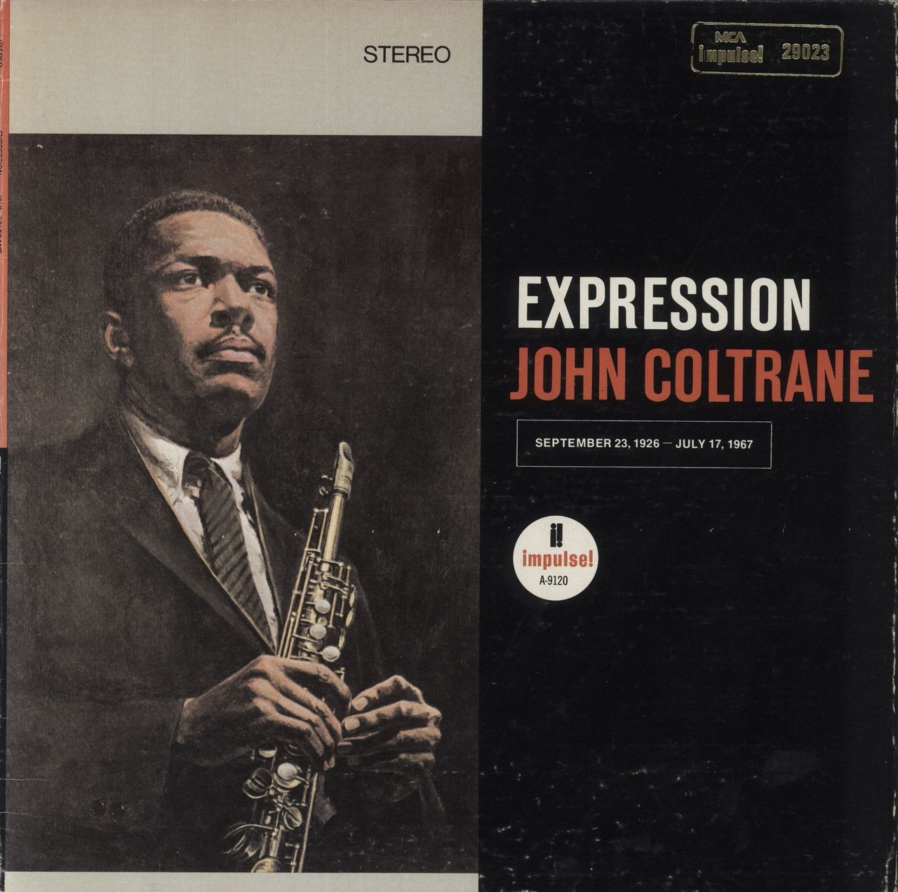 JOHN COLTRANE Expression (1980 Swedish blue rainbow MCA/Impulse label 4-track stereo LP, featuring Alice Coltrane, Jimmy Garrison, Rashied Ali and Pharoah Sanders, engineered by Rudy Van Gelder. Includes Coltrane's very last recorded work, a particular highlight being the sixteen minute long flutes and piccolo dialogue between 'Trane and Pharoah Sanders. The pasted picture sleeve reveals a little storage wear with age and remains superb with additional "export only"gold stamps on the front and reverse. The vinyl, kept in an additional anti-static inner, shows very little superficial wear grading excellent overall. A real gem! A-9120)