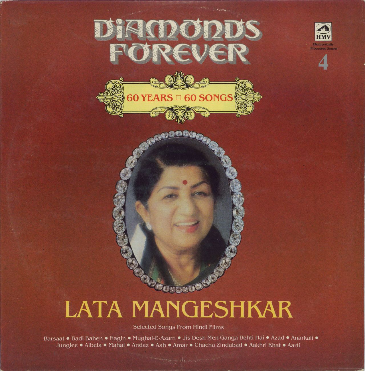 LATA MANGESHKAR Diamonds Forever - 60 Years 60 Songs - Volume 4 (1989 Indian-only 15-track LP on the black & white 'nipper stamp' label, featuring selected songs from Hindi Films performed by the late great playback singer, unique pasted picture sleeve. The sleeve shows some minor ring wear scuffing & the vinyl is clean & in Excellent condition with a few faint paper scuffs not affecting play PMLP4012)