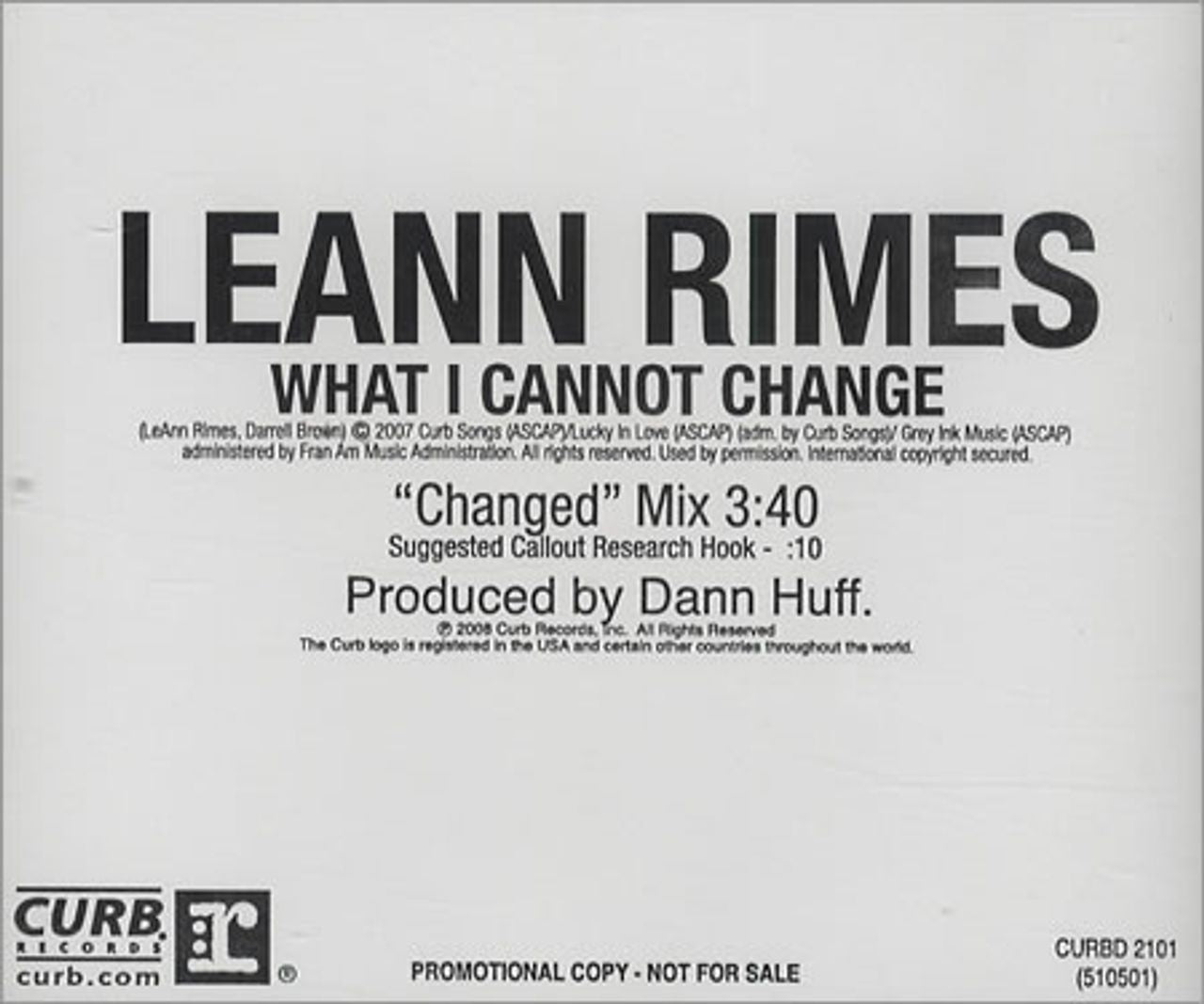 LEANN RIMES What I Cannot Change (2008 US 2-track promotional only CD featuring the 'Changed' Mix and Callout Research Hook, custom printed disc complete with a title/tracklisting back insert CURBD-2101)