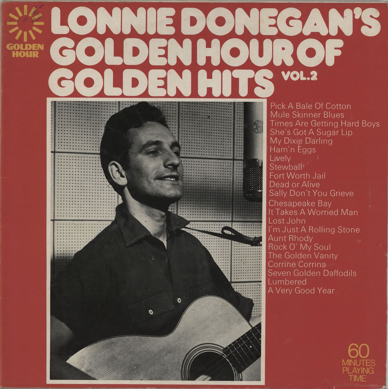 LONNIE DONEGAN Golden Hour Of Golden Hits Vol. 2 (1973 UK 22-track LP pressed on black vinyl which is translucent red when held to the light. A great compilation from the skiffle king, including ChesapeakeBay, Mule Skinner Blues, Forth Worth Jail, Lumbered and many more, embossed picture sleeve, with a sleevenotes on the reverse. The sleeve has a little general storage wear, whilst the vinyl shows little sign of play GH565)