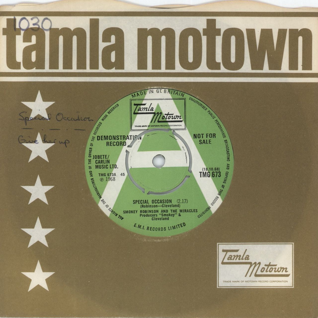 SMOKEY ROBINSON & THE MIRACLES Special Occasion (Rare original 1968 UK Tamla Motown green with white 'A' demo label 2-track 7" vinyl single, also including Give Her Up. The original 4-prong centre is intact and the release date of 18.10.68 isprinted on the right hand side of the A-side label in black. The labels are clean and the vinyl is in Excellent condition! TMG673)