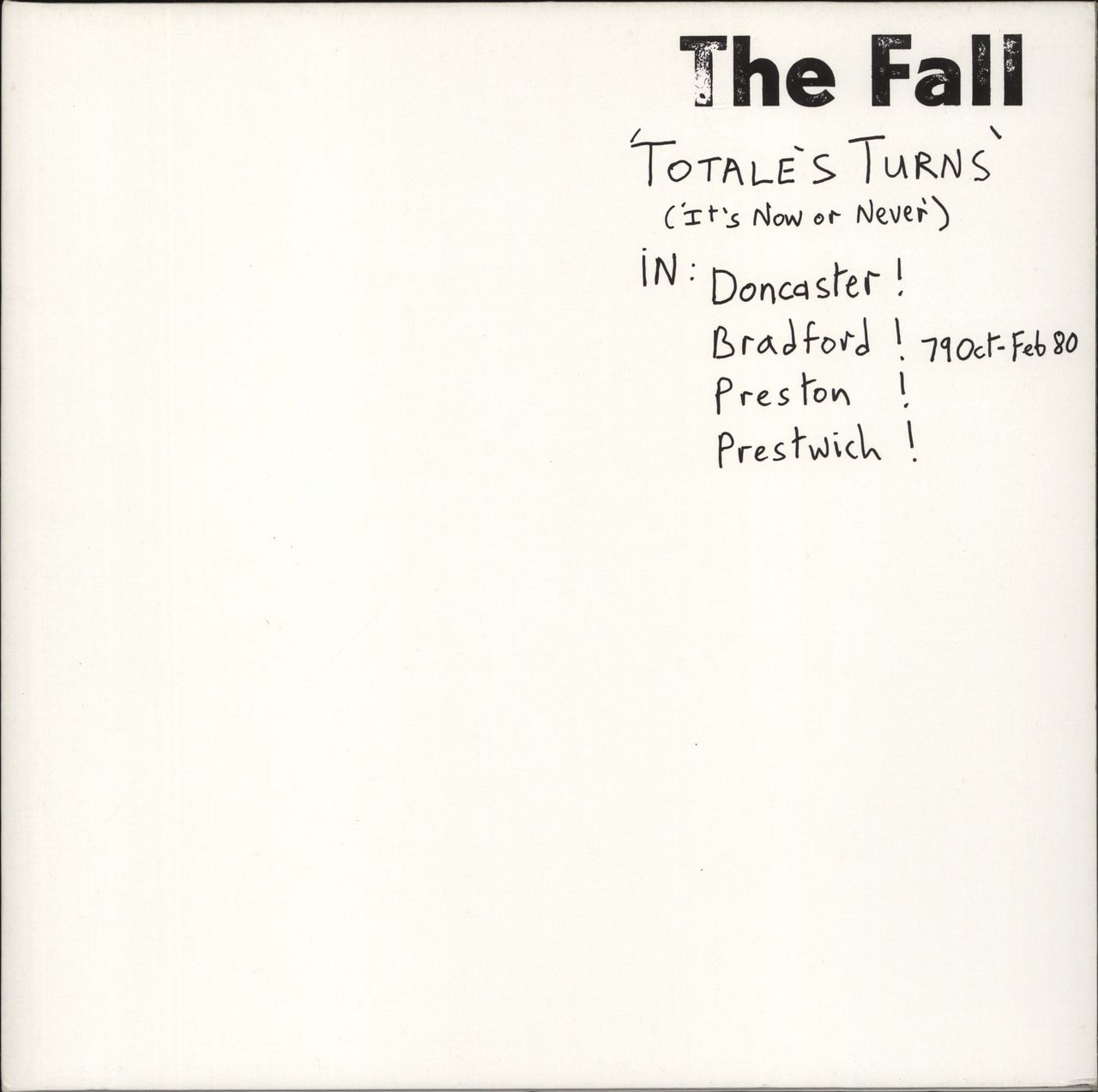 THE FALL Totale's Turns [It's Now Or Never] (2017 UK limited edition reissue of their 1980 11-track vinyl LP - Given The Fall's penchant for iconoclasm, it's no surprise that they decided to say goodbye to the '70s with a series of gigs at Northern England's gruffest halls. Totale's Turns never panders to live-record conventions, serving instead as a gripping exhibit of The Fall en masse and arguably the most accurate document of the group to date. The vinyl shows minor play but remains in excellent condition within the black & white titled gatefold sleeve with extensive liner notes printed within)