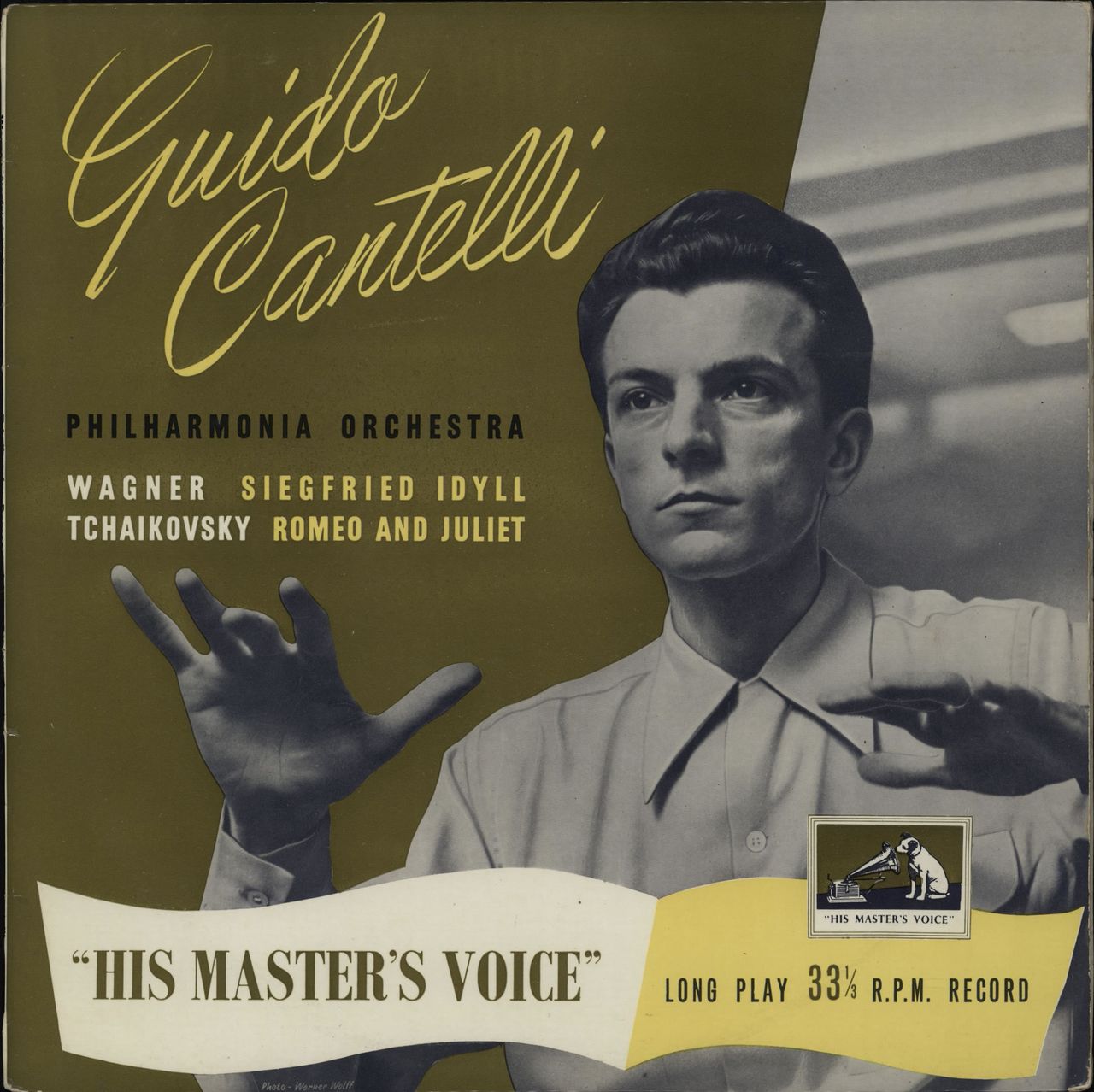THE PHILHARMONIA ORCHESTRA conducted by GUIDO CANTELLI Wagner: Siegfried Idyll / Tchaikovsky: Romeo And Juliet (1953 UK LP on the gold print 'Nipper' label, fully laminated scalloped flipback picture sleeve. The sleeve shows just a little light shelfwear & the vinyl remains Near Mint ALP1086)