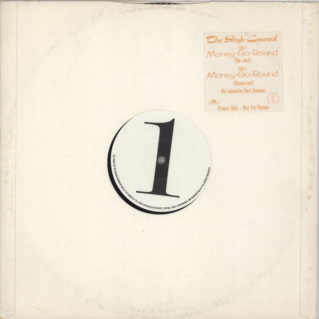 THE STYLE COUNCIL Money Go Round (Rare 1983 UK 3-track 12" vinyl promo single. Two remixes by Bert Bevans, easily distinguished by the intro (the brass riff of the original being removed). The Remix features the original lengthy lyrics, the Dance Mix is largely instrumental, with some samples, die-cut sleeve with tracklisting sticker. The vinyl shows only light signs of play TSCX2DJ)