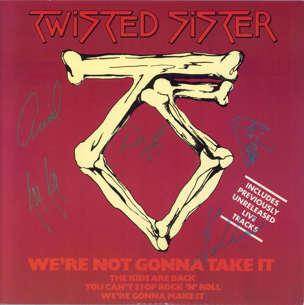 TWISTED SISTER We're Not Gonna Take It (1984 UK FULLY AUTOGRAPHED 4-track 12" vinyl single featuring the Live Versions of The Kids Are Back, You Can't Stop Rock 'N' Roll and We're Gonna Make It, housed in a picture sleeve. The front of the sleeve has been signed by Dee Snider, Jay Jay French, Eddie Ojeda, Mark Mendoza and A.J. Pero in silver & golder marker pens. This copy also comes complete with a handful of fantastic fanclub letters written to the previous owner, keeping themupto date with current SMF news and also includes an official Twisted Christmas card! All housed in the origianl mailer the 12" was originally sent in! An essential package for any fan of this legendary band!)