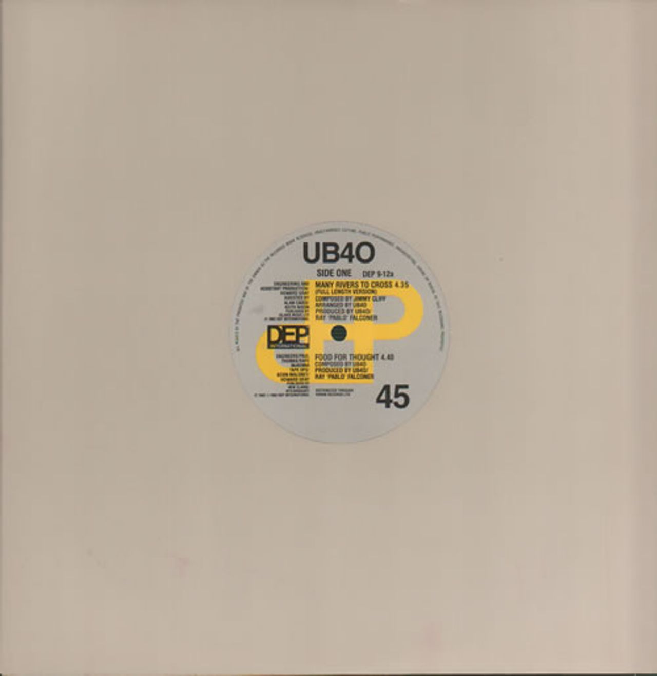 UB40 Many Rivers To Cross (1983 UK 3-track 12" vinyl single, a huge selling cover of the Jimmy Cliff classic, backed with the full length version of Johnny Too Bad and Food For Thought, plain die cut company sleeve DEP9-12)