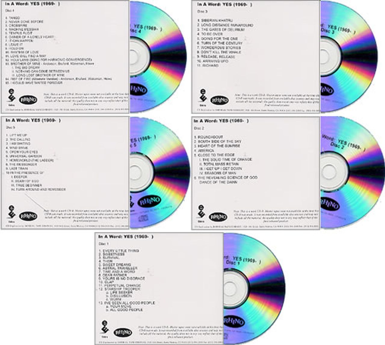 YES In A Word [1969 - ] (2002 US SET OF FIVE Rhino advance promotional CD-R acetates for the spectacular box set, including a total of 55 tracks, and featuring both custom printed discs and title tracklisting inlays different to the commercial release, rare!)