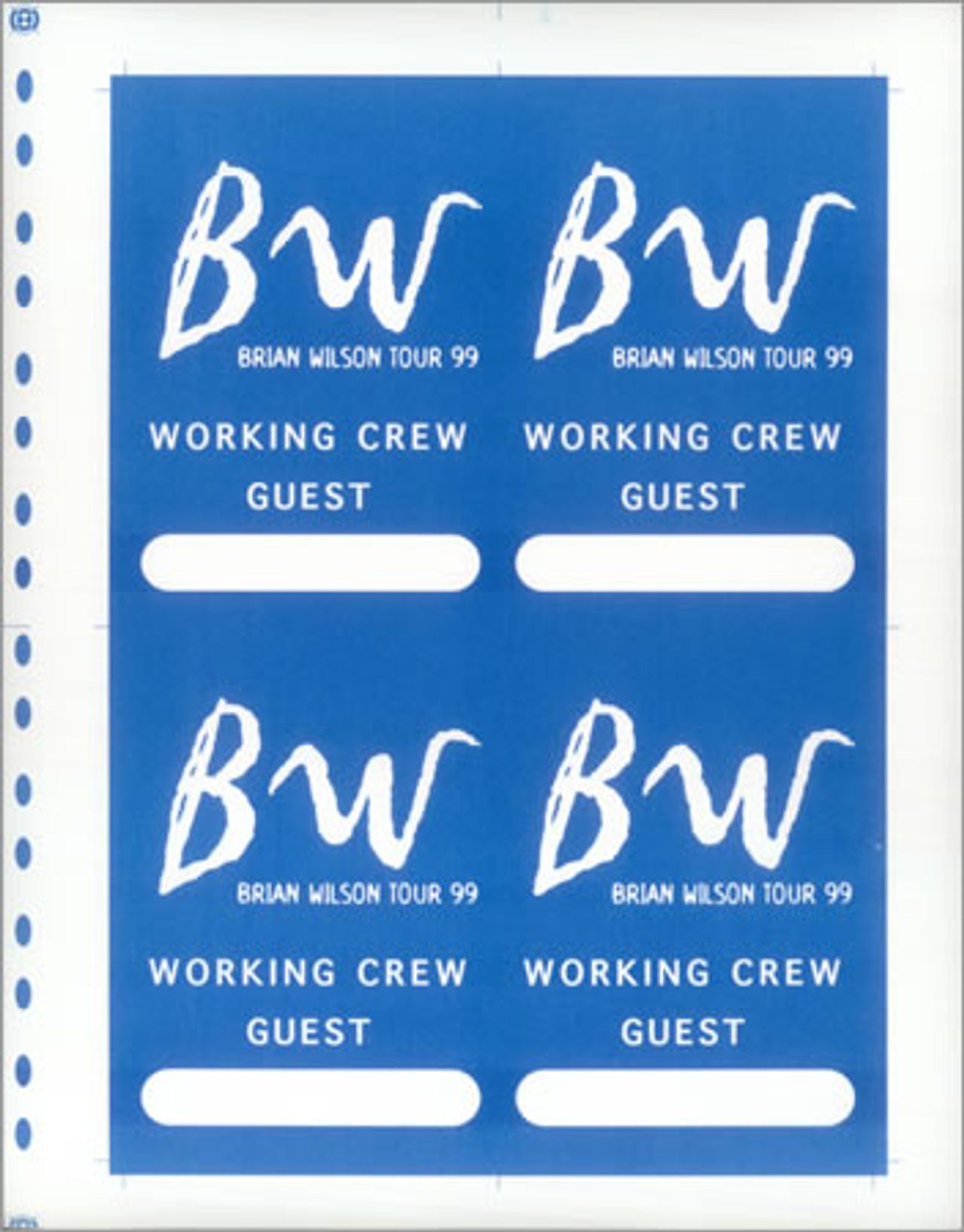 BRIAN WILSON Tour 99 (Scarce uncut press sheet of tour passes measuring 22cm x 28cm, this sheet contains 4 rectangular shaped satin 'WORKING CREW GUEST' passes. The actual cut passes would have been issued during the 1998 tour. Each pass has a blue background with white 'BW' logo at the top and 'Brain Wilson Tour 99' white text below, pass type at the bottom along with a space for name/id to be written.This sheet was made by 'Perri' who are one of the main manufacturers of genuine tour passes - hard to find in this uncut state)