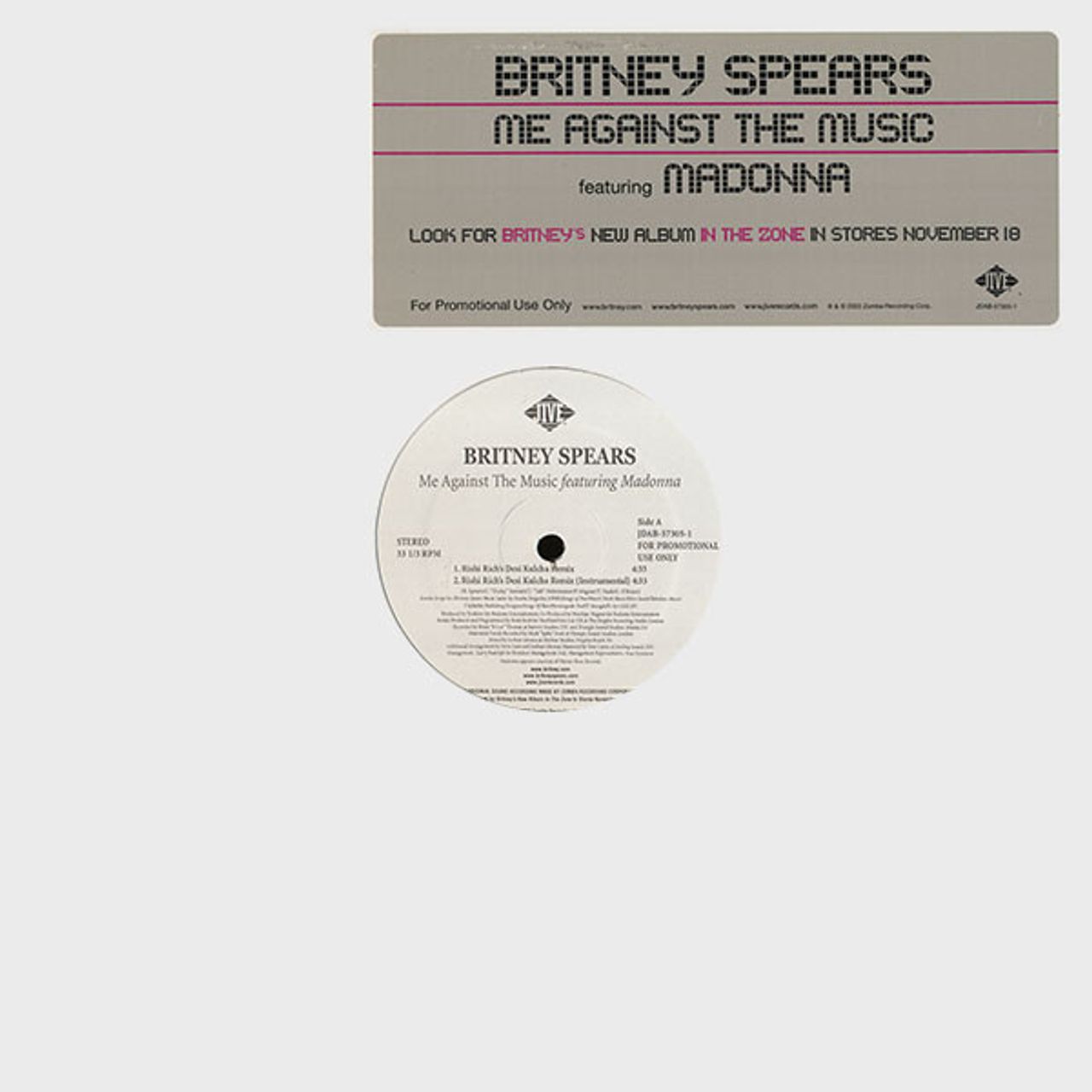 BRITNEY SPEARS featuring MADONNA Me Against The Music (2003 US promotional 4-track vinyl 12” single featuring Rishi Rich's Desi Kulcha Remix and Instrumental, the Video Mix and Video Instrumental. Housed inside its original die-cut sleeve with large hype sticker. This rare 12-inch was for DJ's only and the two Instrumental Mixes did not appear on the commercially available 12" single release!)