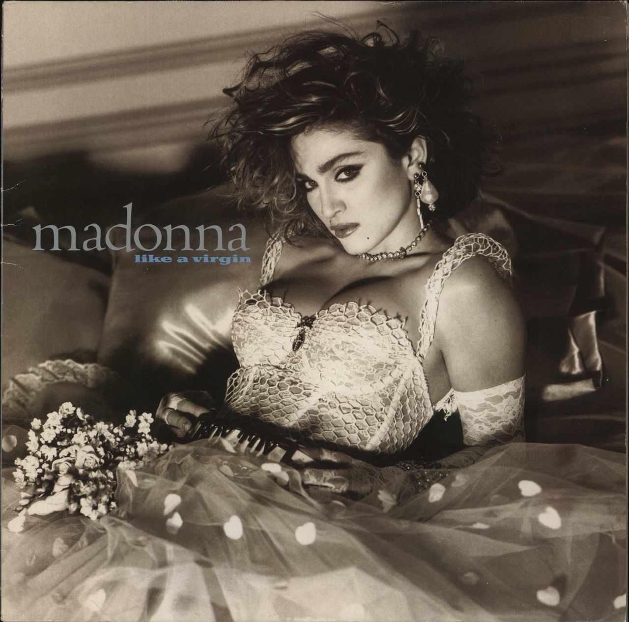 MADONNA Like A Virgin (1984 German 9-track vinyl LP including the singles Material Girl, Angel, Dress You Up and the classic title track Dress You Up; glossy picture sleeve plus illustrated lyric inner. The sleeve shows an area of gloss loss and some minor signs of shelfwear while the vinyl looks barely played - an excellent example)