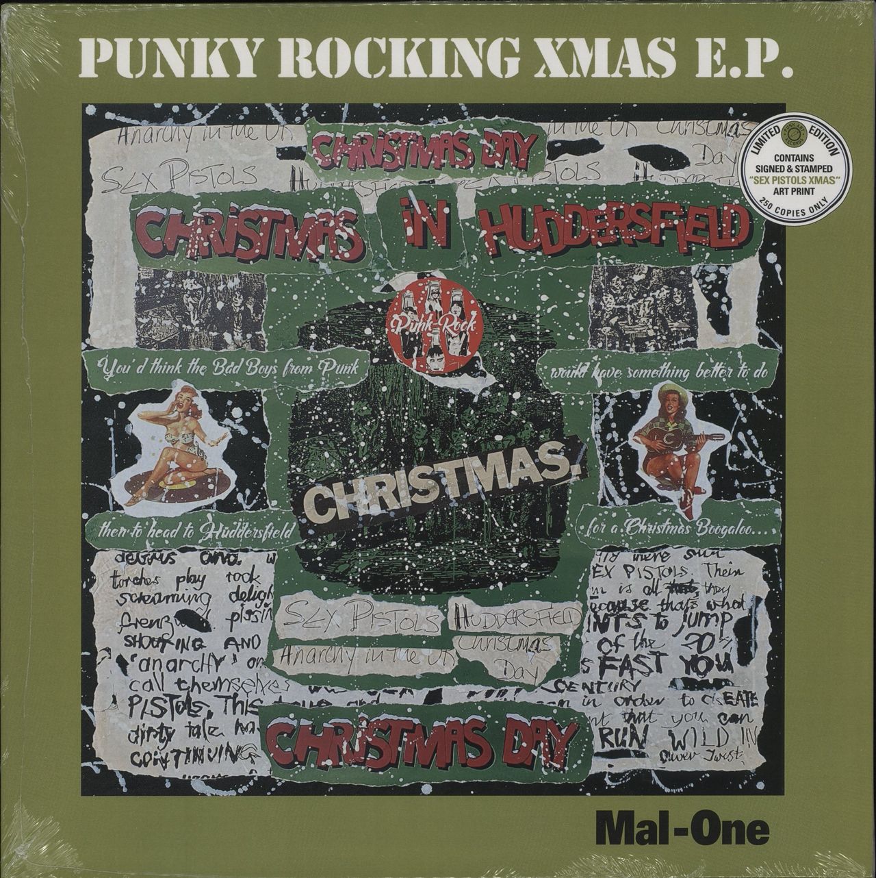 SEX PISTOLS Punky Rocking Xmas EP - SEX PISTOLS sleeve (2025 UK limited edition 4-track 12" vinyl single from London art terrorist MAL-ONE featuring his homage to 2 legendary Christmas gigs back in the halcyon days of punk, The Clash at AcklamHall, London in 1979 & the infamous Sex Pistols show at Huddersfield in 1977. Sealed picture sleeve with lyrics on reverse complete with blind stamped & hand signed (by MAL-ONE) 11" x 11" colour art print. Limited edition of 250 copies only!MAL-ONE12-005)