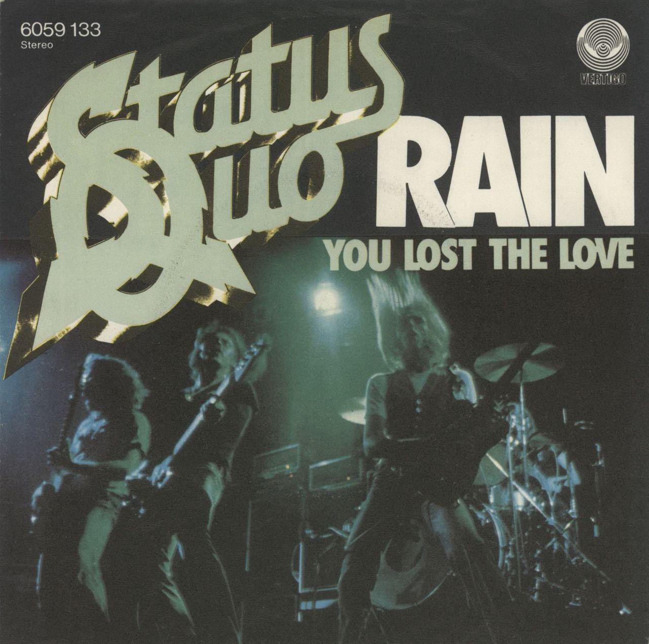 STATUS QUO Rain (1976 German injection moulded label wide centre 7" single, also including You Lost The Love, textured picture sleeve featuring the interlocking artist logo, later reissued with the normal logo. The sleeve shows just some lightwear and, aside from a few very light paper scuffs, the vinyl shows very little signs of play)