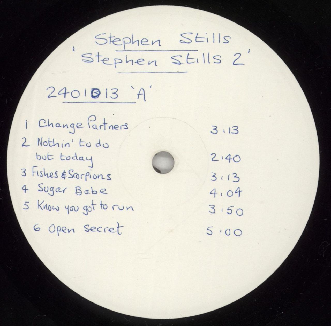 STEPHEN STILLS Stephen Stills 2 (Very rare 1971 UK 12-track white label vinyl LP test pressing Stills' second album, with 2401013 A1 and 2401013 B1 etched matrices. The labels have hand annotated tracklistings and the record is housed in a plain die-cut sleeve, with the vinyl showing minimal signs of play and grading Excellent. This was manufactured solely to check the quality & the sonics of the pressing before the finished product was manufactured. A highlycollectable CSNY related rarity and the first we've offered for sale. Recommended)