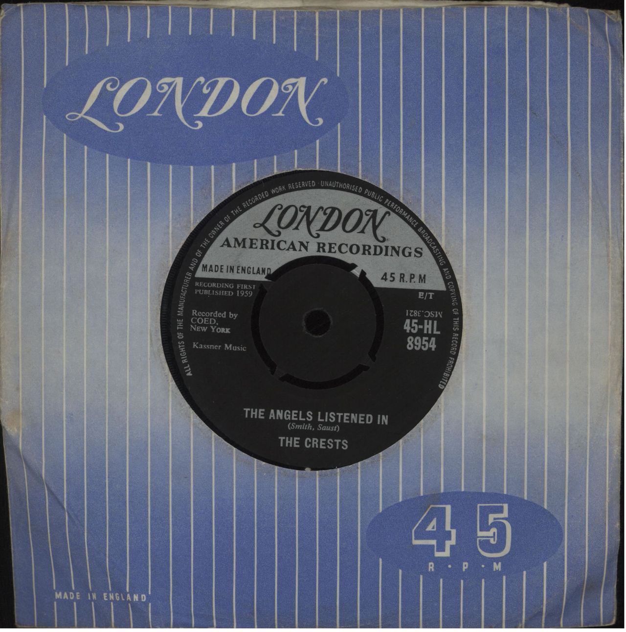 THE CRESTS The Angels Listened In (1959 UK 7" vinyl single with intact four prong centre, also including I Thank The Moon, London company die cut paper sleeve 45-HL8954)