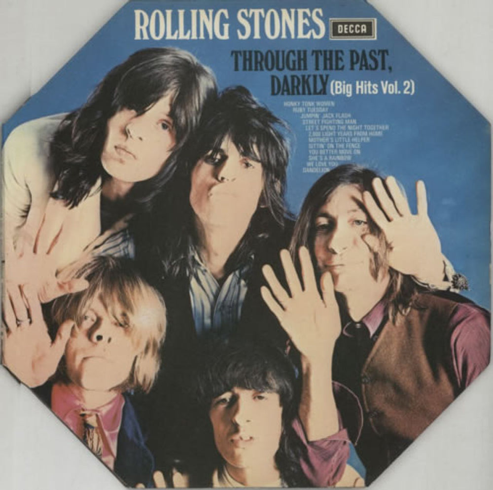 ROLLING STONES Through The Past Darkly (70s UK 12-track Decca 'boxed' logo label stereo third issue of the 1969 compilation LP, front laminated octagonal shaped gatefold picture sleeve with die-cut mono/stereo identifying hole on the reverse cover and blue cut-to-shape inner. The sleeve shows very little wear & the vinyl remains in superb near 'as new' condition with few signs of play SKL5019)