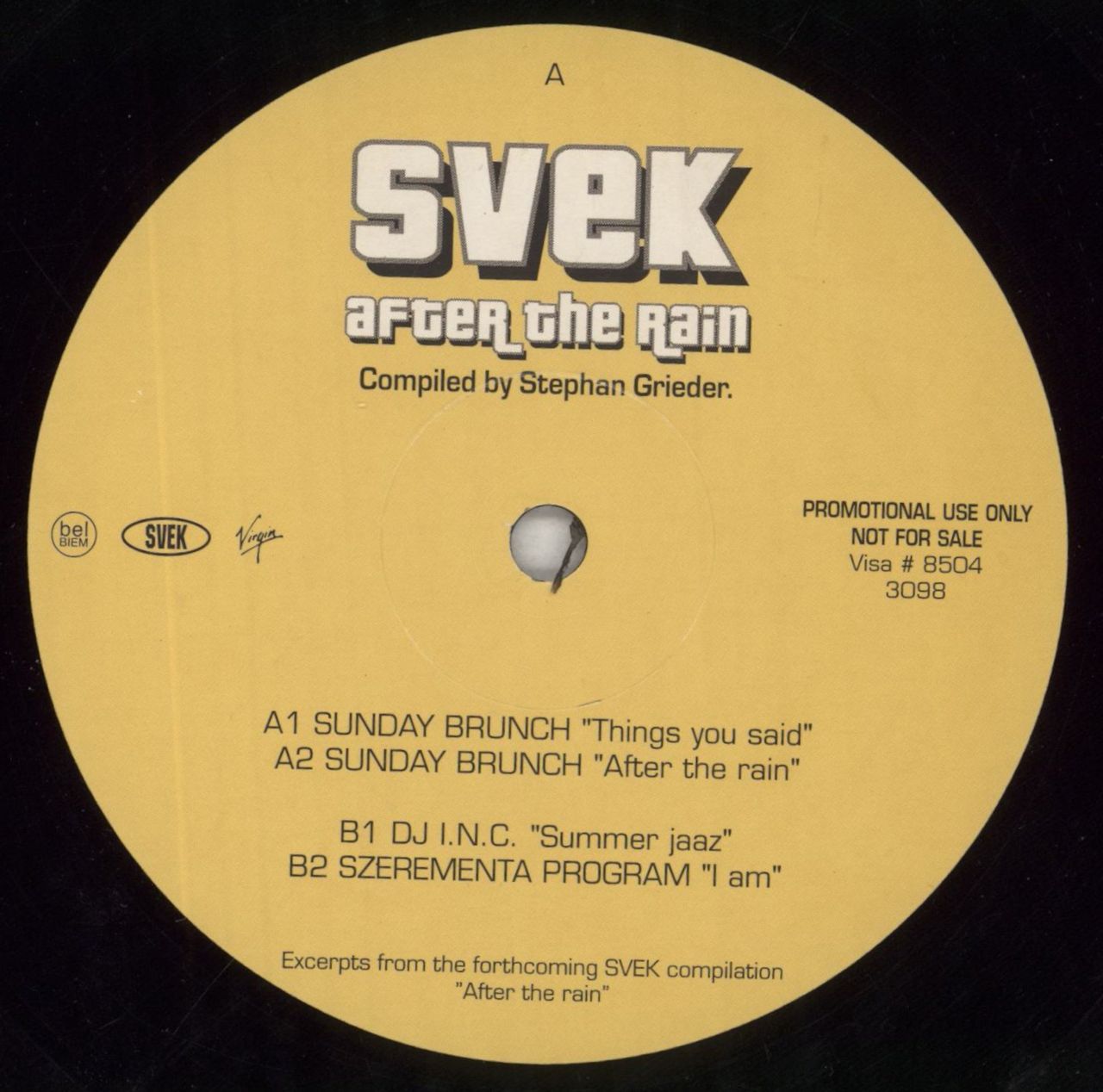 VARIOUS-DANCE After The Rain (2000 French 4-track 12" vinyl promo EP. House and acid jazz compilation, featuring Sunday Brunch, DJ I.N.C. and Szerementa Programs. Includes Svek/Virgin records press release. Plain die-cut sleeve VISA#8504)