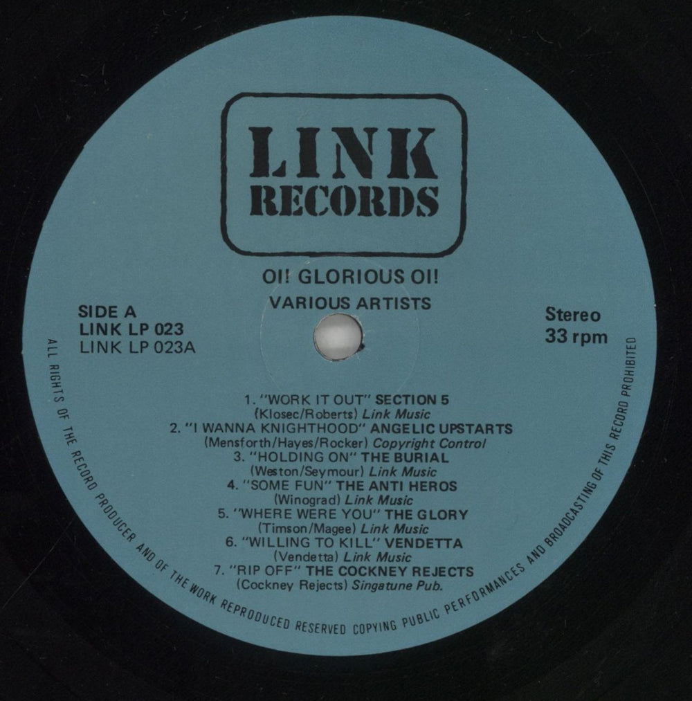 VARIOUS-PUNK & NEW WAVE Oi! Glorious Oi! (1987 UK 14-track vinyl LP. A compilation of punk and oi! Featuring Angelic Upstarts, The Cockney Rejects, Sham 69 and more! Picture sleeve. The sleeve has a small sticker mark on the top right corner and shows some notable edgewear and creasing. The vinyl is Excellent with the odd cosmetic hairlines and few signs of play. An ideal play copy )