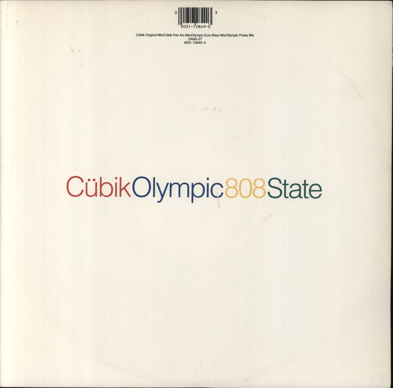 808 STATE Cubik / Olympic (1990 UK 4-track 12" vinyl single including the Original & Pan Am mixes of Cubik plus Euro Bass & Flutey remixes of Olympic. A vital piece of Mancunian dance music history. The titled sleeve has some minor shelf and ring wear and the vinyl shows a couple of cosmetic scuffs ZANG5T)
