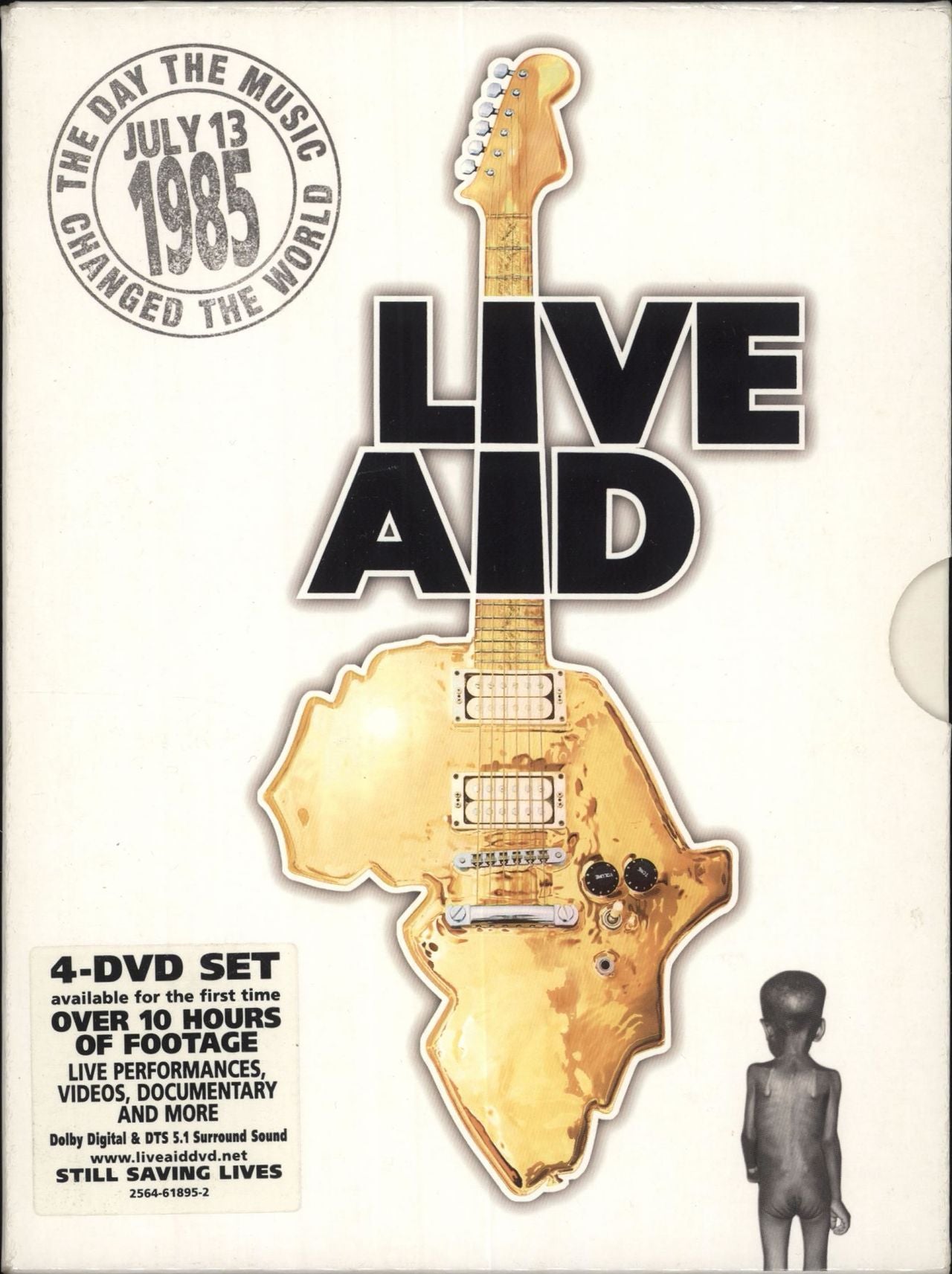 BAND AID Live Aid (2004 UK Region 2 PAL DVD 4-disc set featuring the world's finest rock & pop stars as they performed simultaneously at London's Wembley Stadium & Philadelphia's JFK Stadium on July 13th 1985 in this historic event, which wasbroadcast to a worldwide audience of over 1.5 billion. Extras include the 'Food & Trucks & Rock'n' Roll' documentary bonus performances including the Band Aid, USA For Africa and Bowie/Jagger 'Dancing In The Streets' videos plus the original BBCreport by Michael Buerke which spurred Sir Bob into action. Approx. 10 hours. Housed in a fold-out digipak picture sleeve with 24-page booket and outer slipcase)