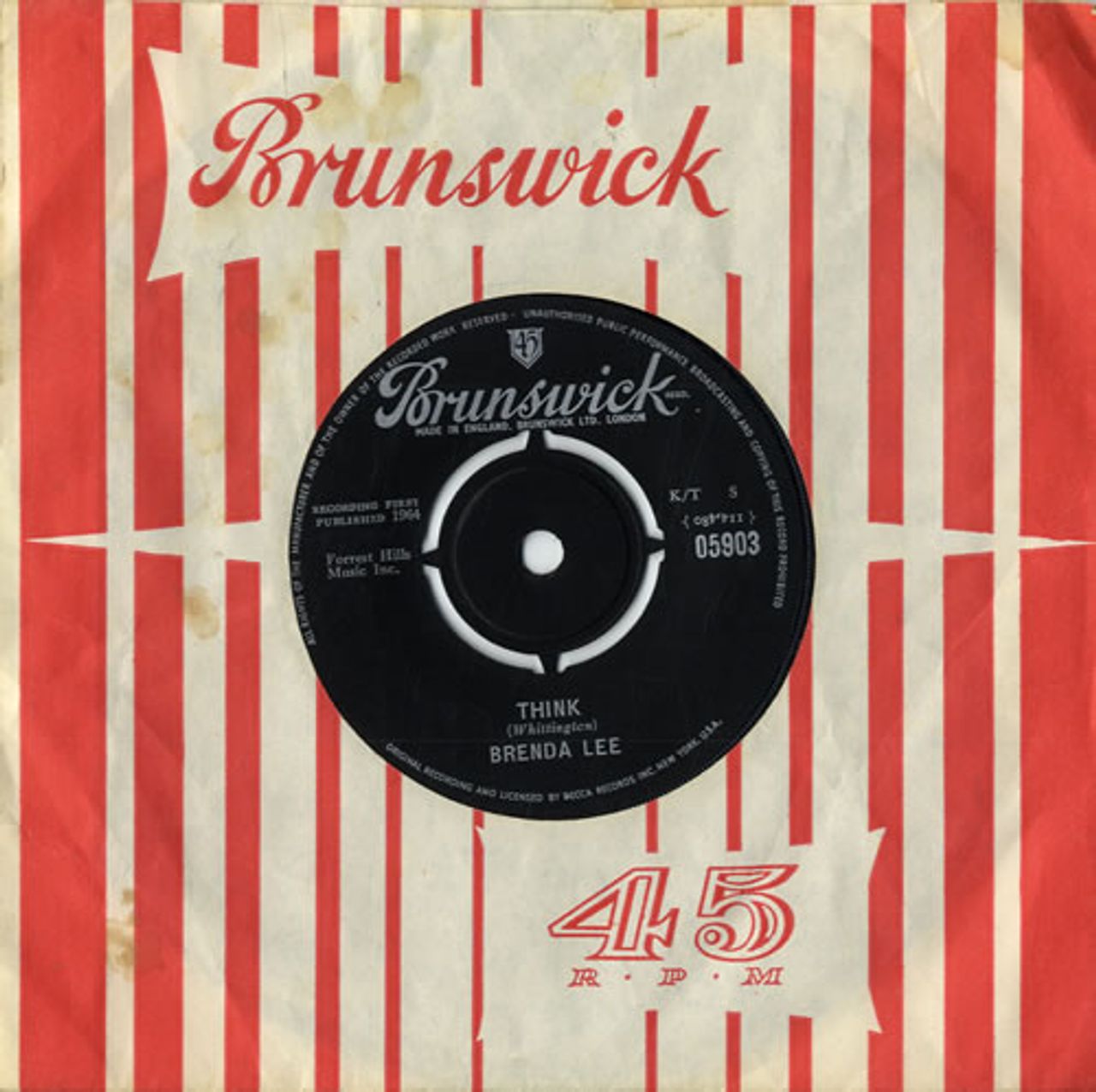 BRENDA LEE Think (1964 UK 7" vinyl single with intact four prong centre, also including The Waiting Game, Brunswick company die cut paper sleeve. The vinyl on this copy remains in excellent condition with just a few light surface scuffs to show for over fifty five years)