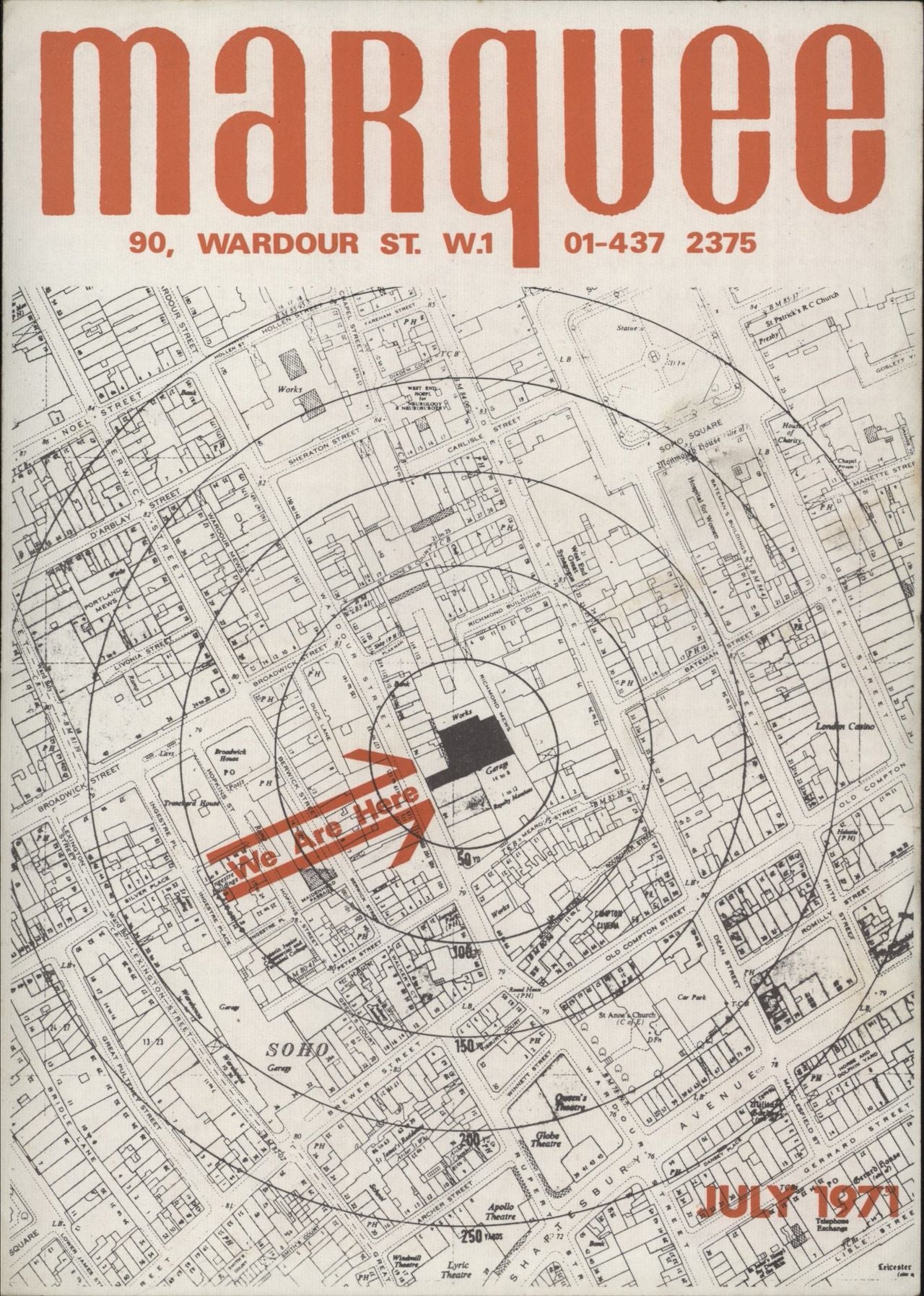 CHARISMA RECORDS Marquee Flyer (Very rare 1971 UK 4-page flyer for the legendary London venue for July with one page dedicated to 'Charisma Week At The Marquee with photographs showing Van Der Graaf Generator, Audience, Lindisfarne, Bell N'Arcand Genesis [9th July, tickets 50p - buy me one while you're at it!], as well as a page of more general upcoming events such as Stray, Chicked Shack, Slade and others. This copy has been folded in the middle and has an annotation to the reverse, how many more are extant is unknown, but unlikely to be many)