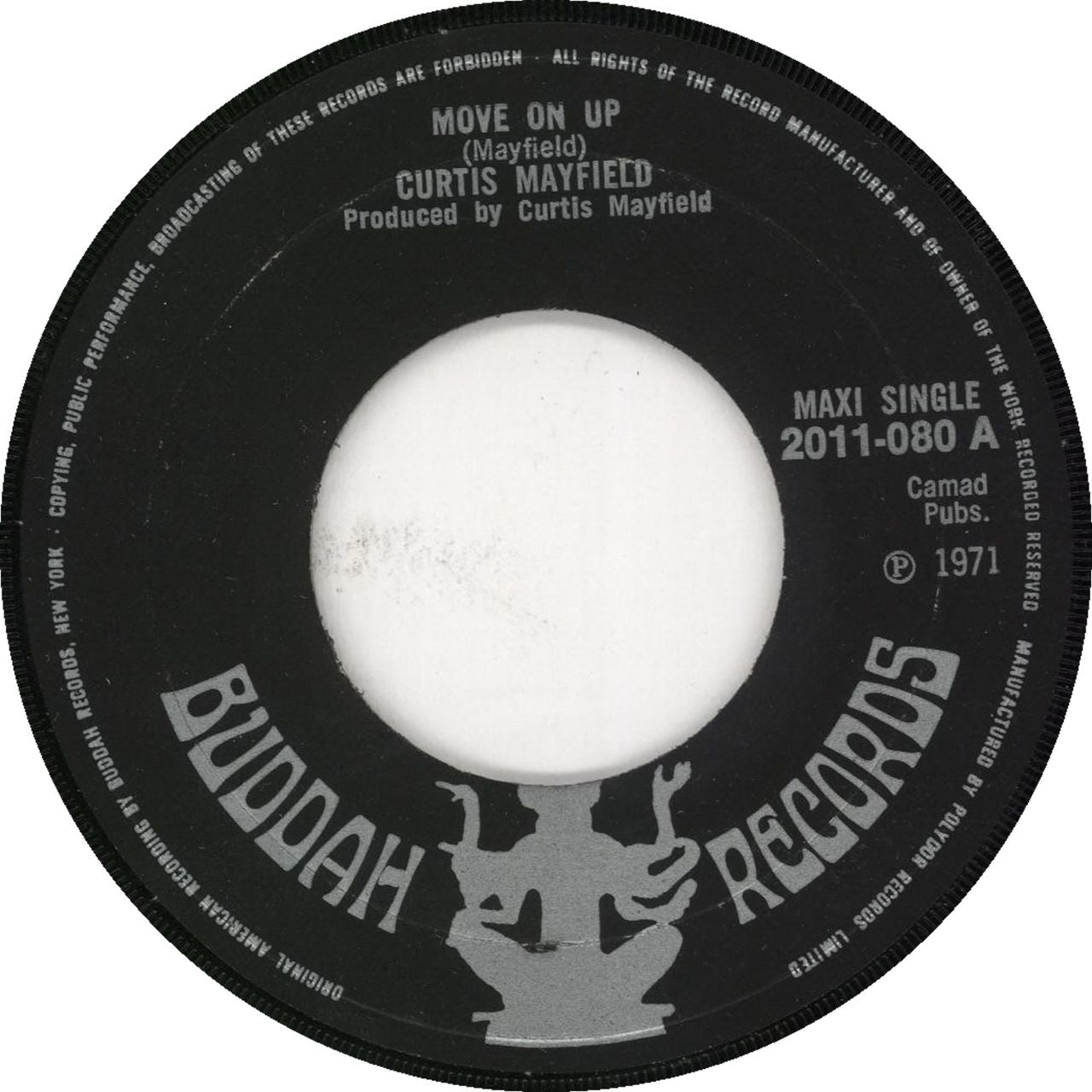 CURTIS MAYFIELD Move On Up (Classic 1971 UK 3-track wide centred 7" vinyl single, also including Beautiful Brother Of Mine & Give It Up, plain die-cut paper sleeve. The vinyl on this copy remains in excellent condition with a star sticker on the a-side with the playing surface showing no obvious wear)