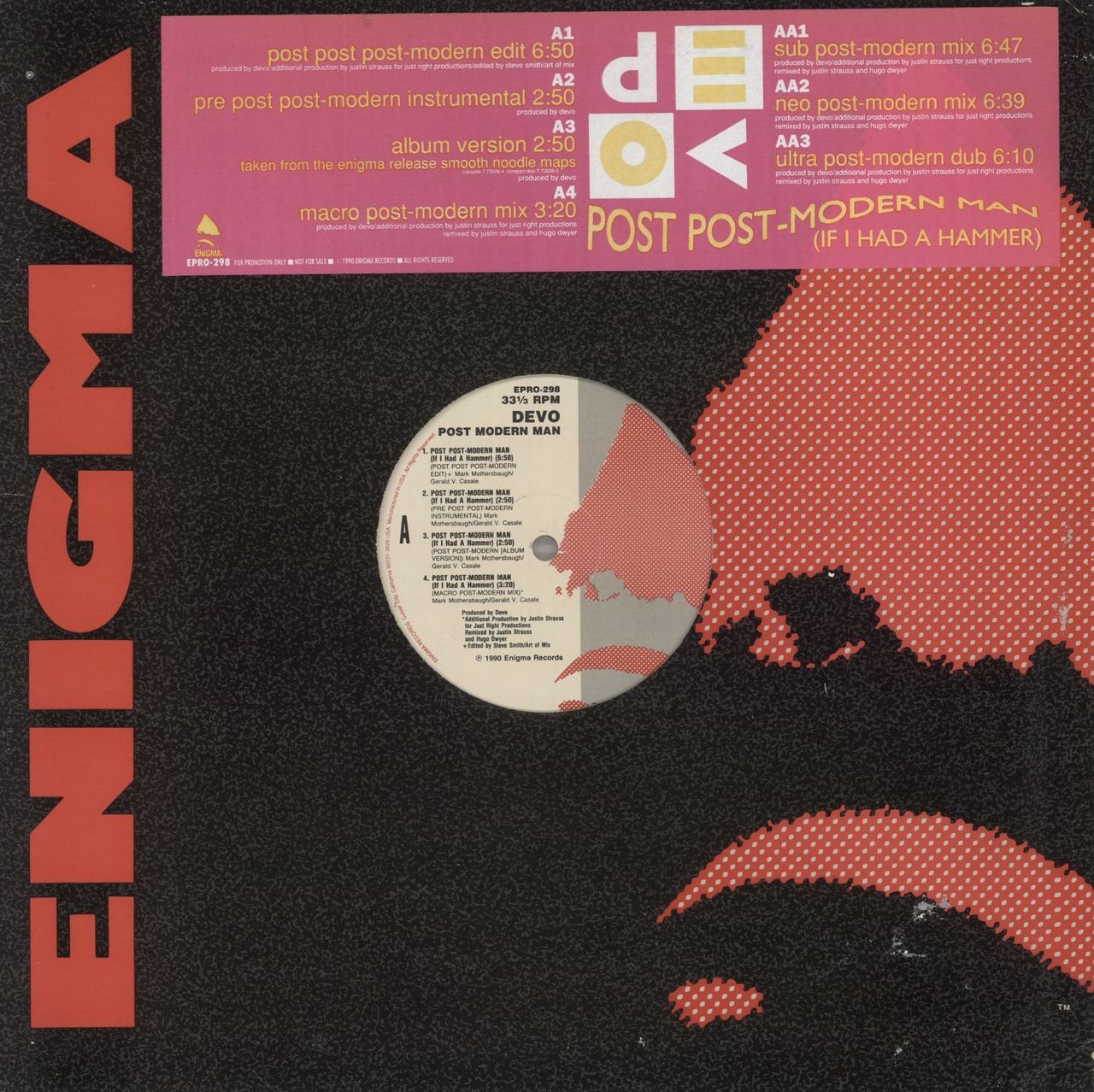 DEVO Post Post-Modern Man (1990 US 7 track 12" vinyl single Promo featuring Post/Pre/Album/Macro/Sub/Neo/Ultra mixes of the tune, The die - cut and hype /title stickered company sleeve and vinyl display minimal signs of shelfwear/play)