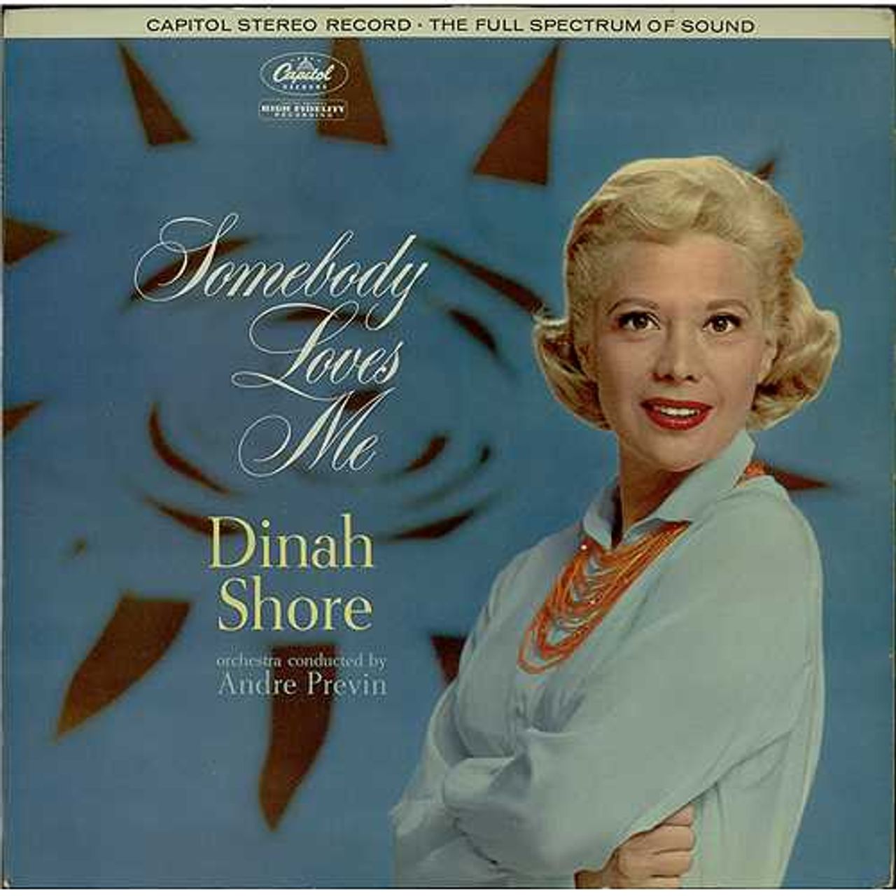 DINAH SHORE Somebody Loves Me (Original 1960 UK Capitol 'rainbow rim' label 9-track STEREO vinyl LP arranged and conducted by Andre Previn, housed in a front laminated flipback picture sleeve. The sleeve shows minimal wear and the vinyl looksbarely played! ST1296)