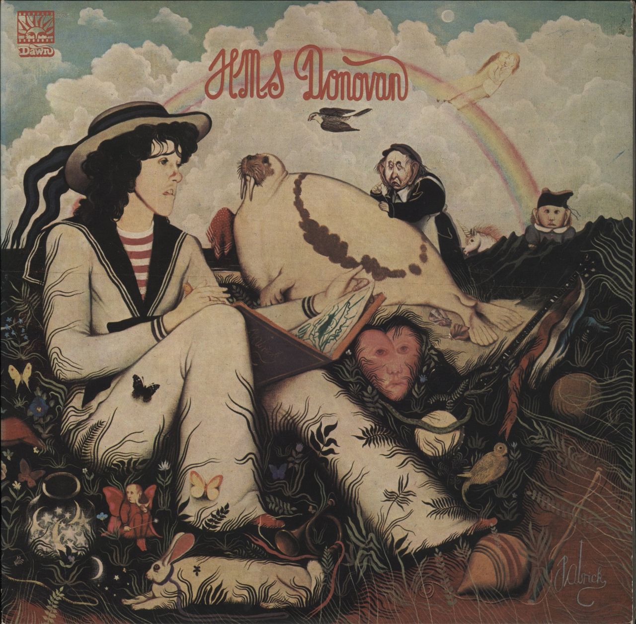 DONOVAN HMS Donovan (Rare 1971 UK 28-track stereo double LP on the lilac Dawn label, striking matt gatefold picture sleeve painted by John 'Patrick' Byrne' showing only very light corner wear and otherwise remaining in superb shape for its age. The labels and vinyl on both discs are clean with very little evidence of play, a fantastic copy! DNLD4001)