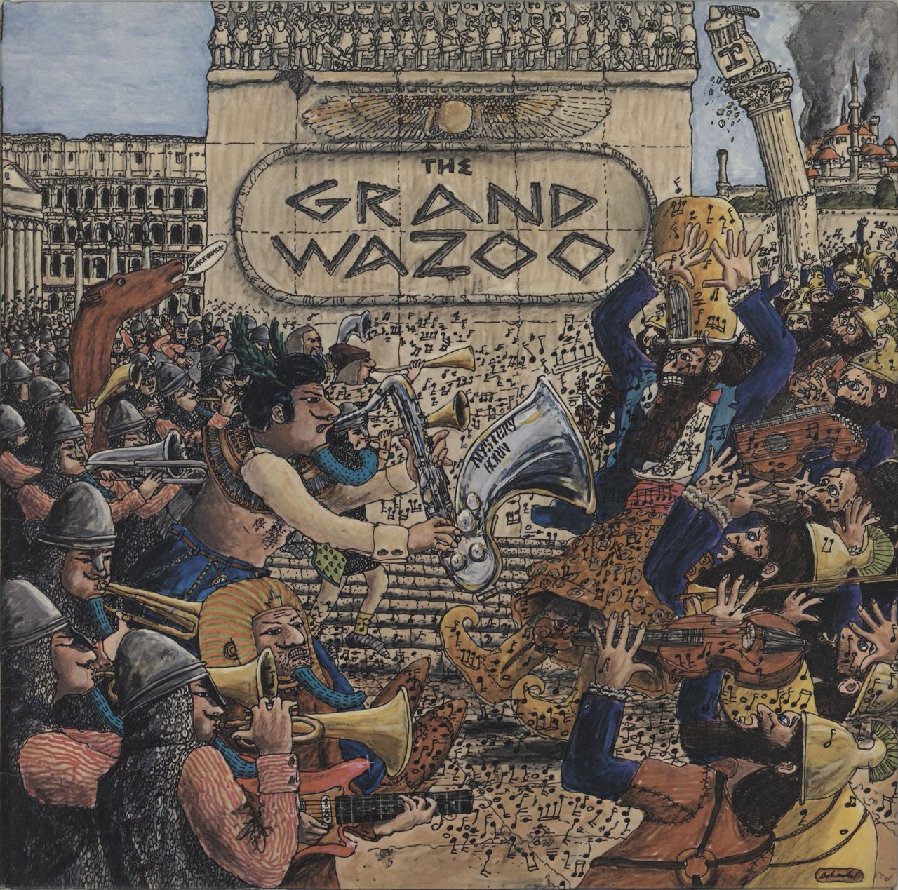 THE MOTHERS The Grand Wazoo (70s UK 5-track LP on the tan 'steamboat' label with 'Made In UK' label print but no 'W' logo perimeter text, housed in a matte gatefold picture sleeve with the many performers from the Wazoo Orchestra listed inside& with another superb Cal Schenkel design. The sleeve shows minimal wear & the vinyl has light signs of play leaving it Excellent K44209)
