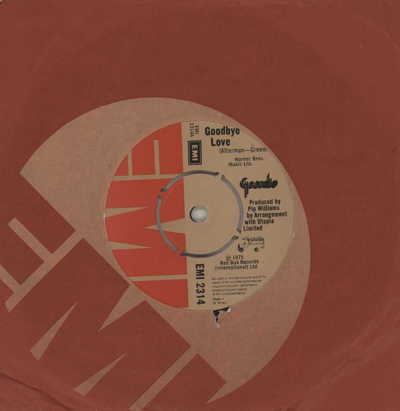 GEORDIE Goodbye Love (1975 UK 7" vinyl single with intact four prong centre, also includes She's A Lady, EMI company die cut paper sleeve EMI2314)