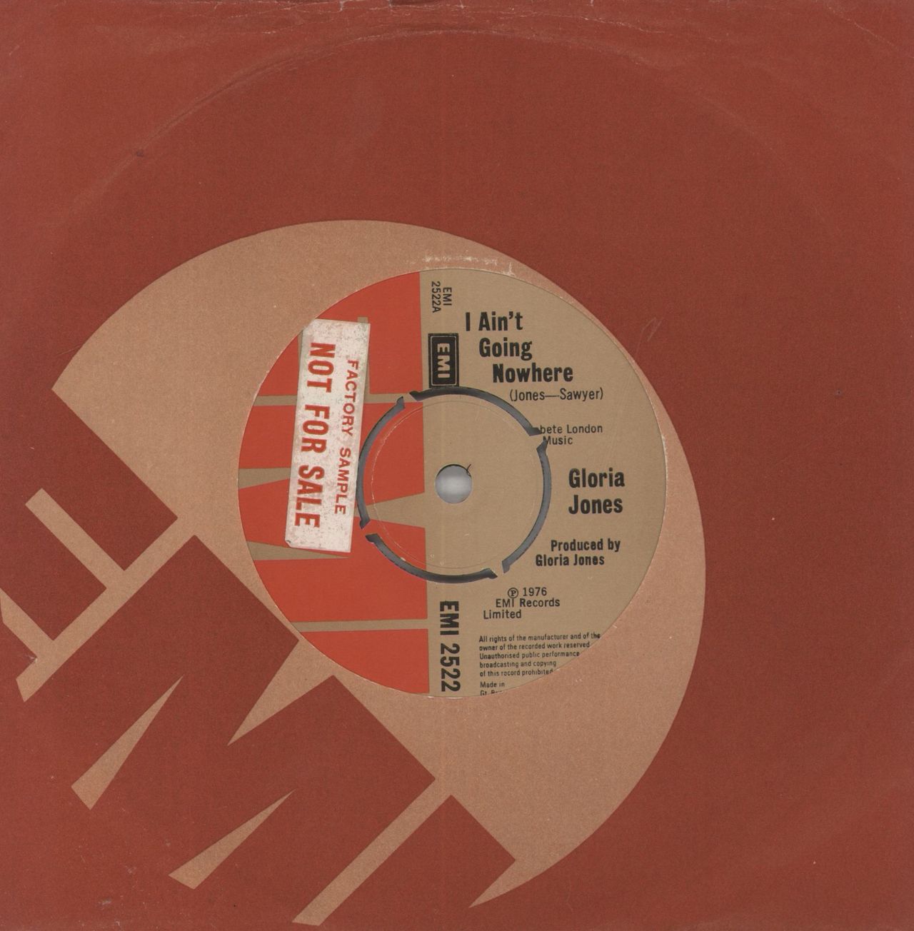 GLORIA JONES I Ain't Going Nowhere (1976 UK vinyl 7" single with an intact four prong centre & 'Factory Sample Not For Sale' sticker to the A Side, also including Simplicity Blues, EMI record company die-cut paper sleeve EMI2522)