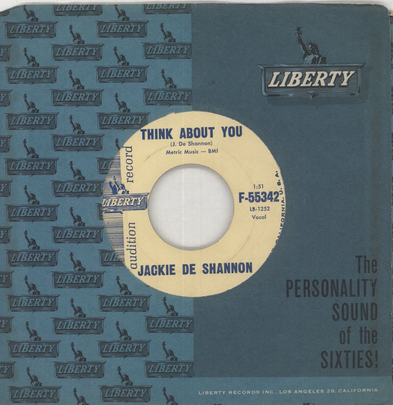 JACKIE DESHANNON Think About You (1961 US wide-centred 7" vinyl single, includes Heaven Is Being With You, Liberty company die-cut sleeve. The vinyl is Near Mint F-55342)