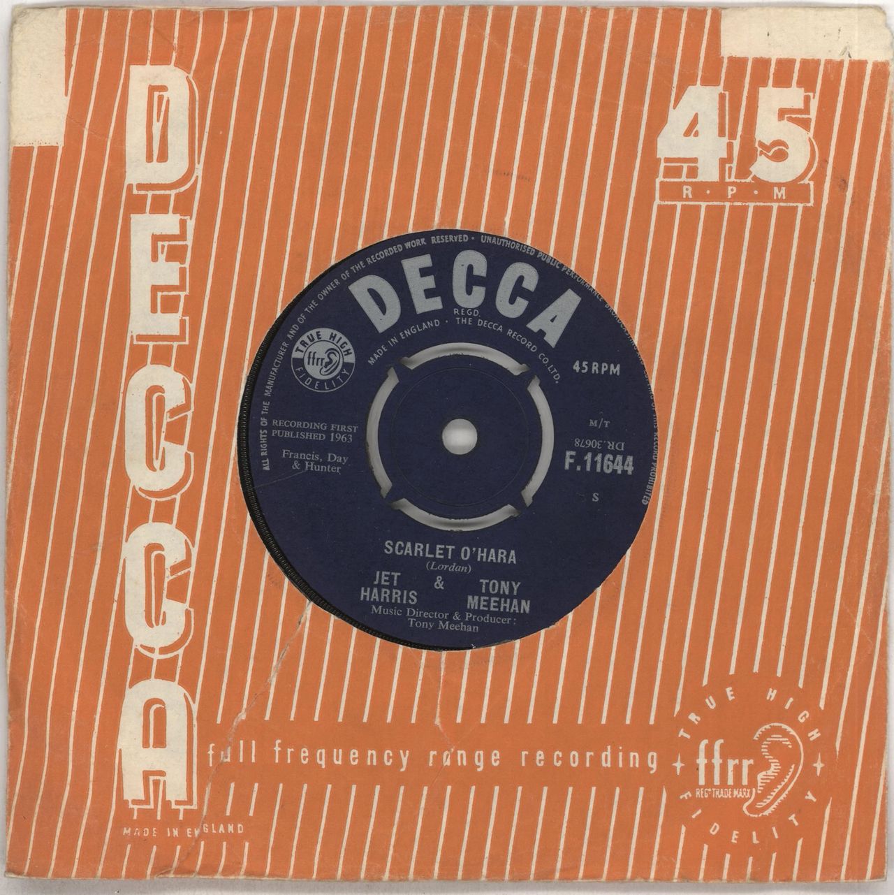 JET HARRIS & TONY MEEHAN Scarlet O'Hara (1963 UK 7" vinyl single with intact four prong centre, also including [Doing The] Hully Gully, Decca die cut paper sleeve F.11644)