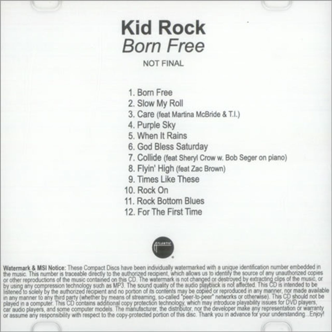 KID ROCK Born Free (Official 2010 US Atlantic 14-track promotional