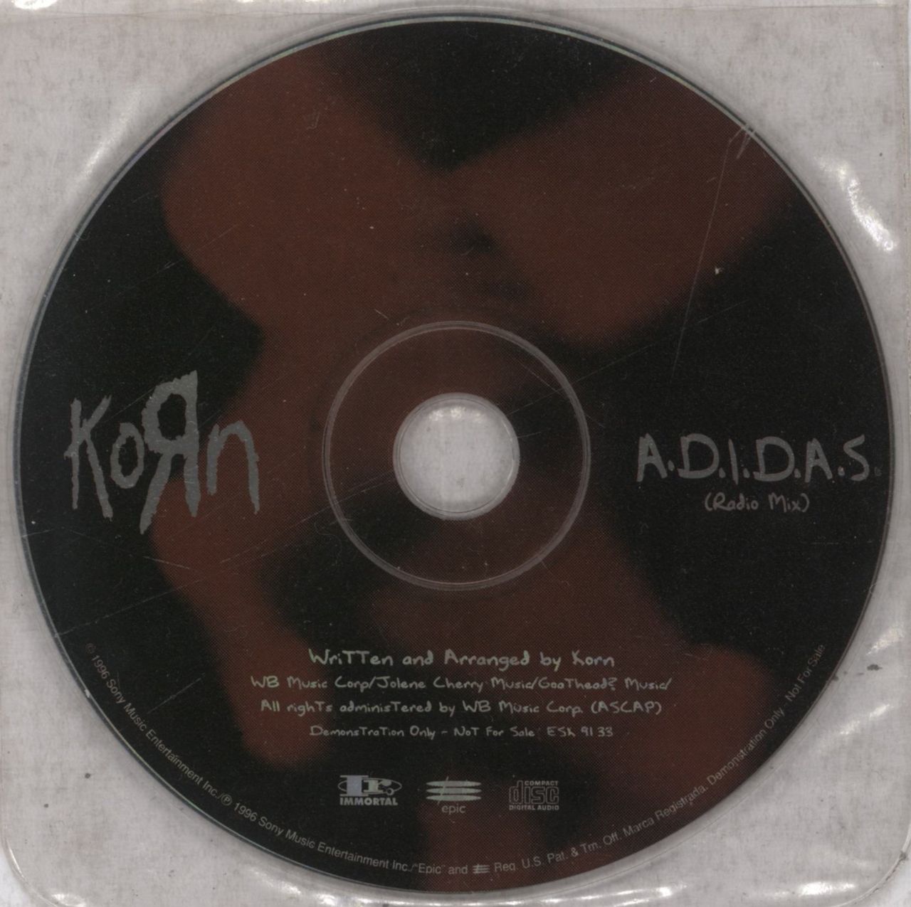 KORN A.D.I.D.A.S. (Scarce 1996 US 1-track promotional only picture printed CD, featuing the Radio Mix, housed in a clear wallet sleeve ESK9133)