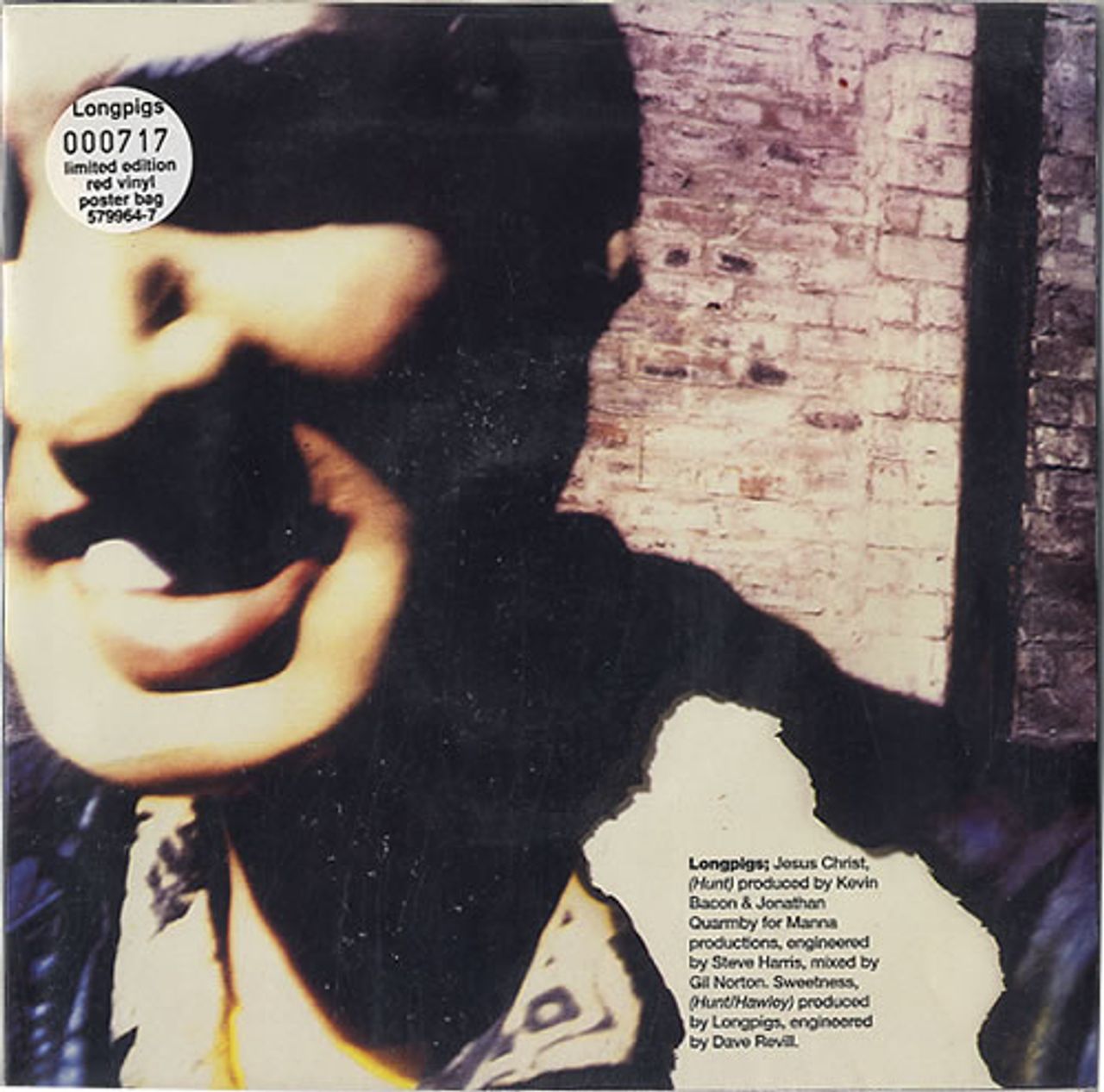 LONGPIGS Jesus Christ (1995 UK limited edition 7" single pressed on Translucent Red Vinyl, also including Sweetness. The vinyl appears in Excellent condition wrapped within the individually number-stickered fold-out poster sleeve MUM68)