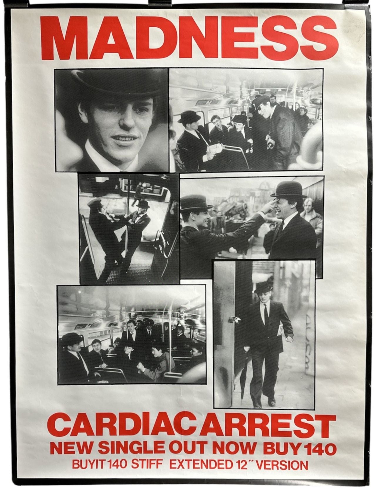 MADNESS Cardiac Arrest (Rare 1983 UK original Stiff Records promotional-only poster featuring a selection of monochrome images taken from the video for the single [with band name and release info in red text]. This item belonged to a prevoiusStiff employee and is in Excellent condition forty-three years on, see more info for dimensions...