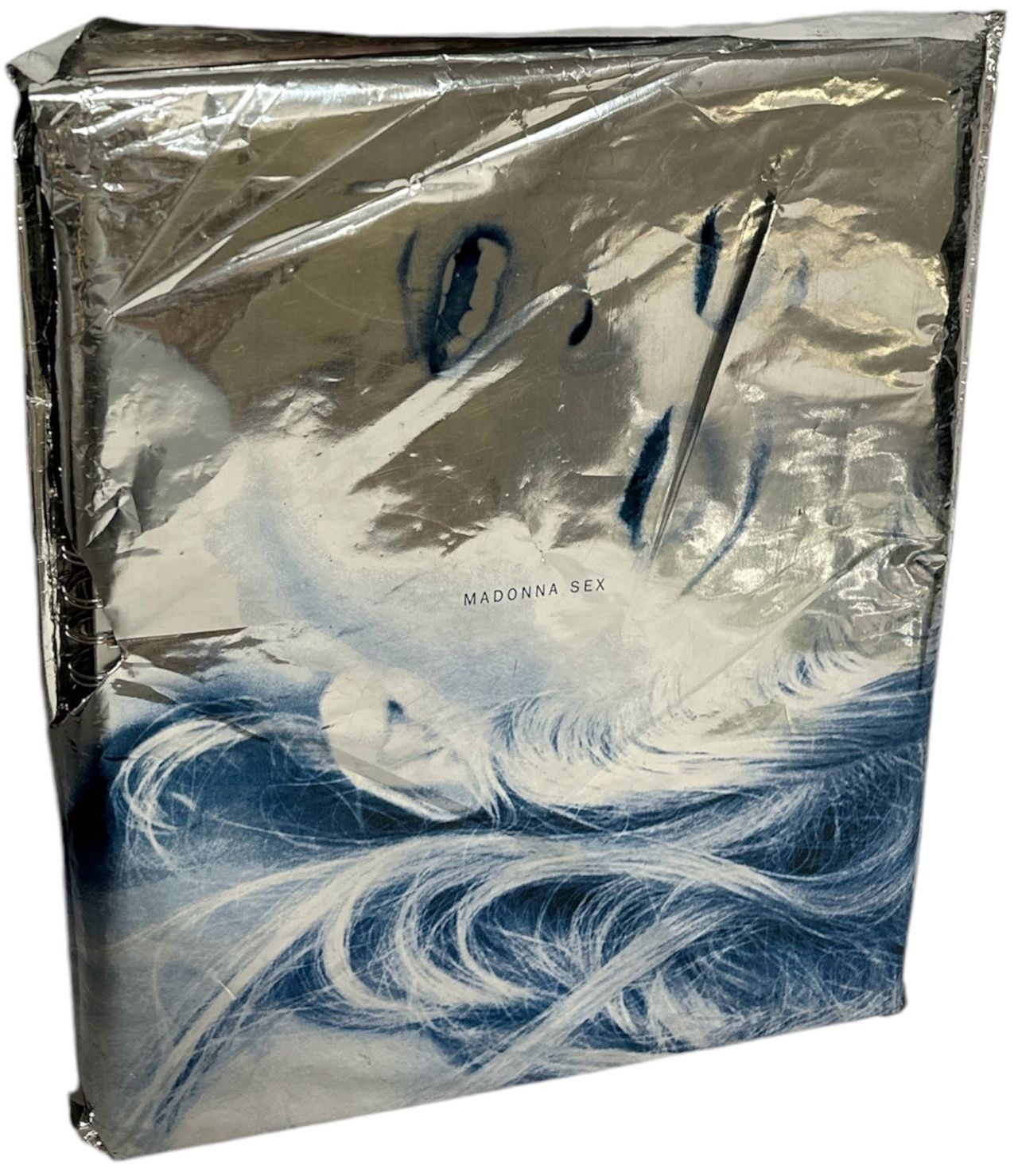 MADONNA Sex (Legendary, long deleted 1992 US large spiral bound book featuring Madonna in many erotic poses, superb metal cover with title stamped on the front and number stamped on the back with opened foil outer sleeve. This copy is missingthe Erotica CD, with a tear to the side of the foil, with light wear to the book, whilst all pages are intact with no rips, scuffs etc.)**Adults Only**