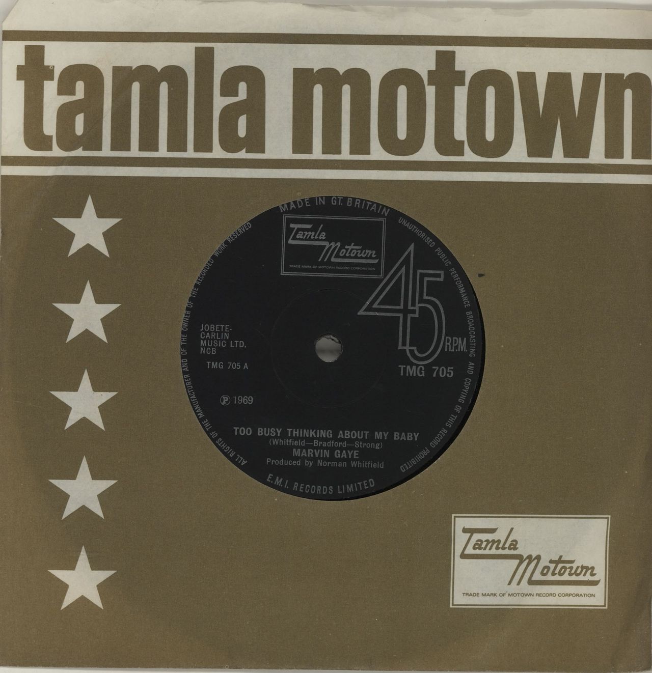 MARVIN GAYE Too Busy Thinking About My Baby (1969 UK solid centre 7" vinyl single, also including Wherever I Lay My Hat, Tamla Motown company die cut paper sleeve TMG705)