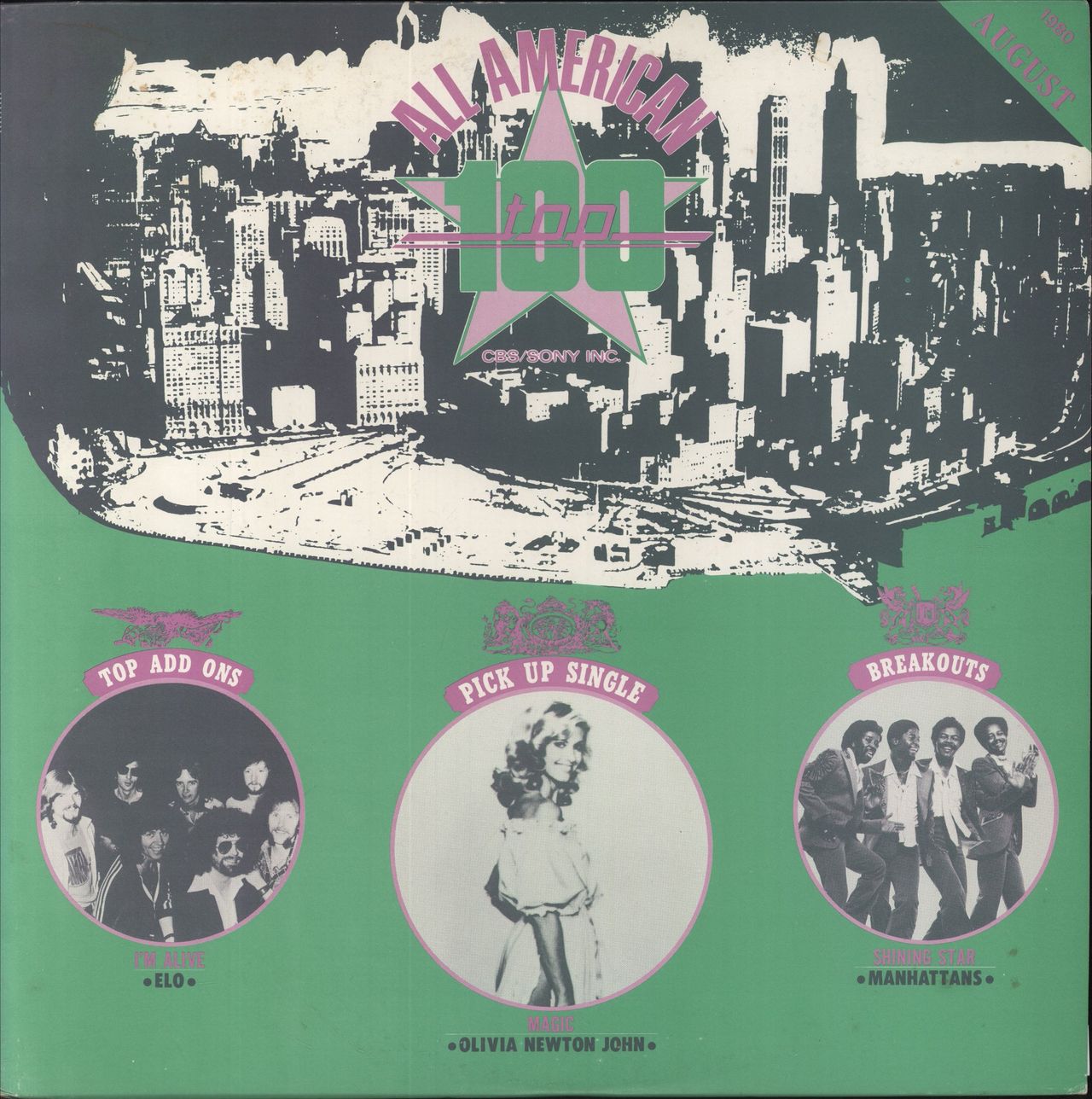 VARIOUS All American Top 100 (August 1980 Japanese 12-track promotional vinyl LP compilation, based on the Billboard chart from 7th July 1980, featuring material from Olivia Newton John, Billy Joel, ELO, Journey and more, housed in a custom pasted promo picture sleeve. The sleeve displays some light general age wear and the vinyl has minimal signs of play)