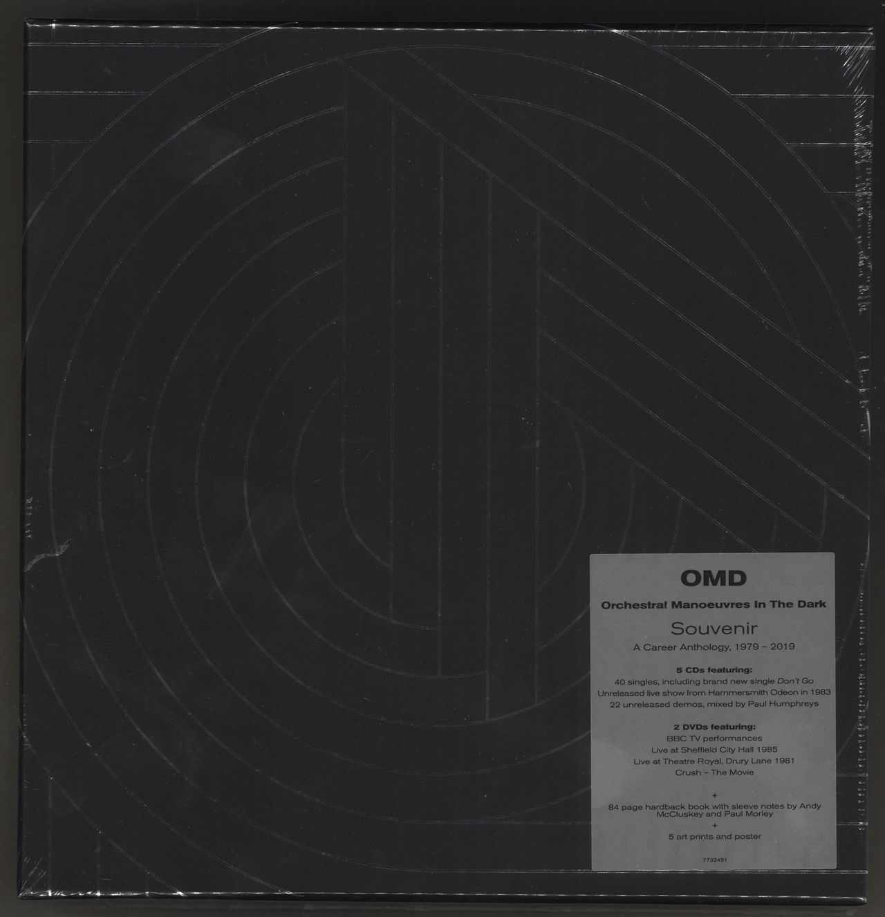 OMD Souvenir (2019 UK Deluxe Limited Edition SEVEN-DISC [5-CD/2-DVD] set comprising a collection of their best loved hits recorded between 1979-2019 with the new recording 'Don't Go'; an unreleased live show from Hammersmith Odeon in 1983 andtwenty-two unreleased demos; plus two DVDs including BBC TV performances, two live performances filmed in Sheffield & London and the 'Crush' Movie. Complete with a 84-page hardback book with sleevenotes by Andy McCluskey & Paul Morley, five art prints and poster. All seven discs are UNPLAYED and housed in a deluxe 9½" x 9½" x 1½" thick picture slipcase which remains sealed in its hype-stickered shrinkwrap)