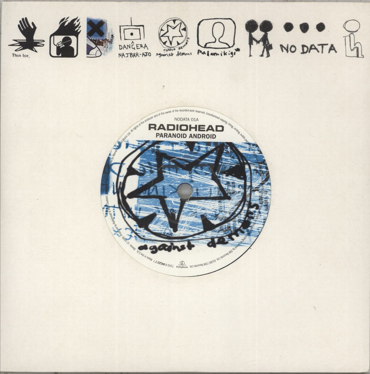 RADIOHEAD Paranoid Android (1997 UK limited edition 2-track 7" single pressed on Blue Marbled Vinyl, also includes Polyethylene [Parts 1 & 2], die-cut picture sleeve with Stanley Donwood's trademark artworkfeatured on the sleeve and labels. The sleeve shows minimal wear and the vinyl appears barely played; remaining in Near Mint condition NODATA01)