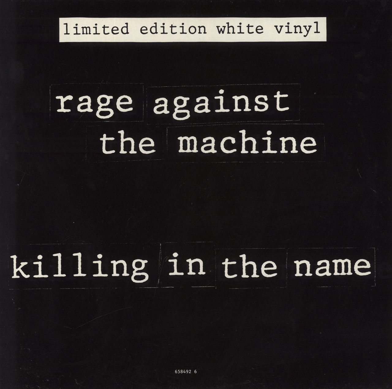 RAGE AGAINST THE MACHINE Killing In The Name (Limited Edition 1993 UK 3-track 12" single pressed on White Vinyl, also featuring Darkness Of Greed & Clear The Lane. The black & white title sleeve is Excellent with a few minor paper marks/scuffto spine & the vinyl is in Excellent condition with few signs of play)
