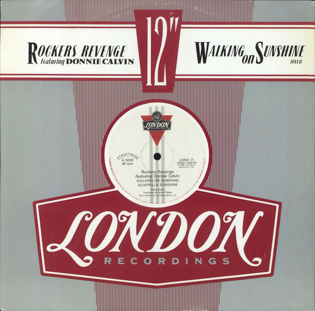 ROCKER'S REVENGE featuring DONNIE CALVIN Walking On Sunshine (1982 UK 4-track 12" single, including four versions of their cover of the classic Eddie Grant track, die cut title sleeve LONX11)