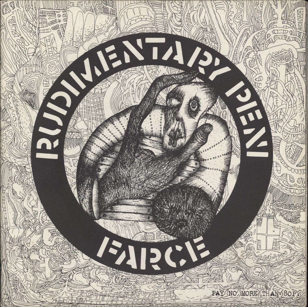 RUDIMENTARY PENI Farce (Rare 1982 UK 11-track 7" EP on Crass Records, with unique picture labels & 'We Know Nothing Of Failure/... The Farce Continues' etched in the run-outs. Comes housed in a six-panel double-sided fold-out poster sleeve featuring lyrics & superb Nick Blinko artwork. The sleeve has pin holes from display but otherwise shows just light signs of wear with a little discolouration to the reverse, whilst the vinyl is clean & grades Excellent, revealing only the odd faint hairline scuff not affecting play. A superb copy forthe punk collector!)