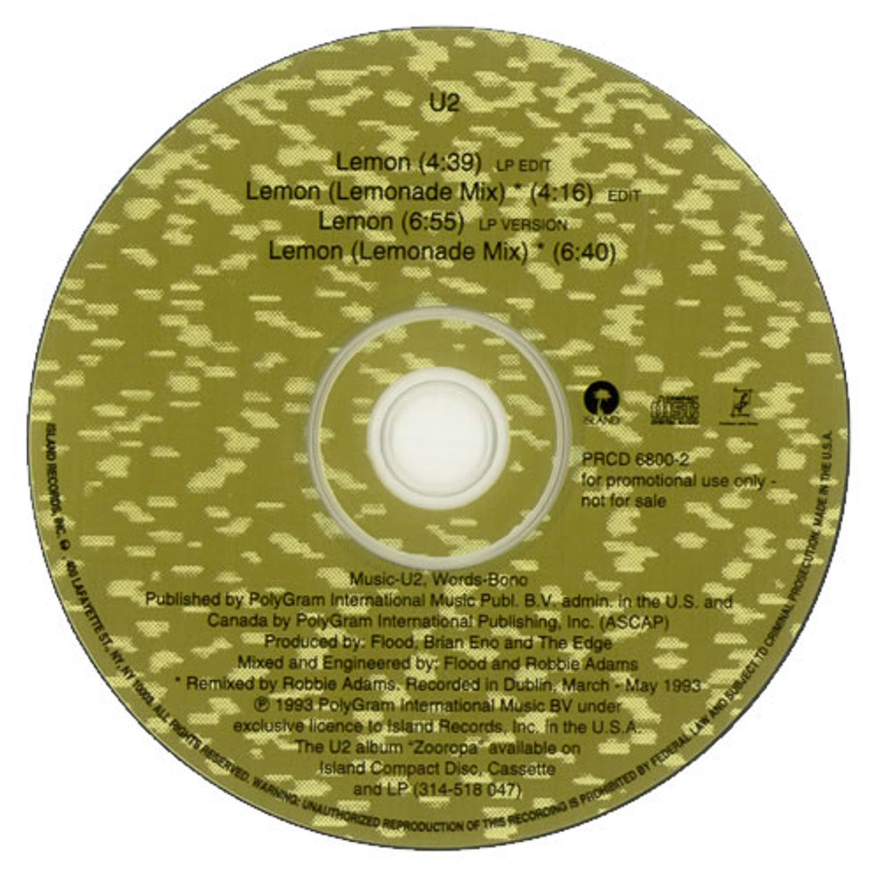 U2 Lemon (Ultra rare 1993 US Island label 4-track promotional CD for the track taken from the Zooropa album, including the Edited & Album versions plus Robbie Adams' Lemonade remixes. The superb yellow shash interference designed disc is housed by itself inside a clear jewel case! PRCD6800-2)