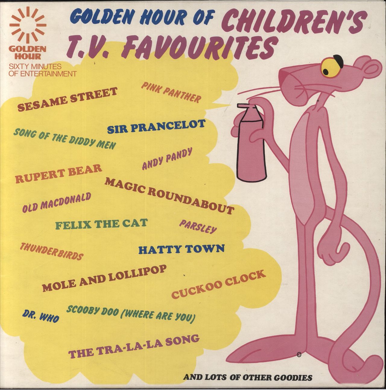 VARIOUS-CHILDRENS Golden Hour of Children's T.V. Favourites (1972 UK 27-track LP pressed on translucent vinyl [when held to a strong light source], includes Pink Panther, Rupert Bear, Thunderbirds, Sesame Street, Dr. Who, Felix The Cat and more, embossed picture sleeve. The sleeve shows minimal wear, whilst the vinyl has a few light scuffs leaving it EX/VG GH547)