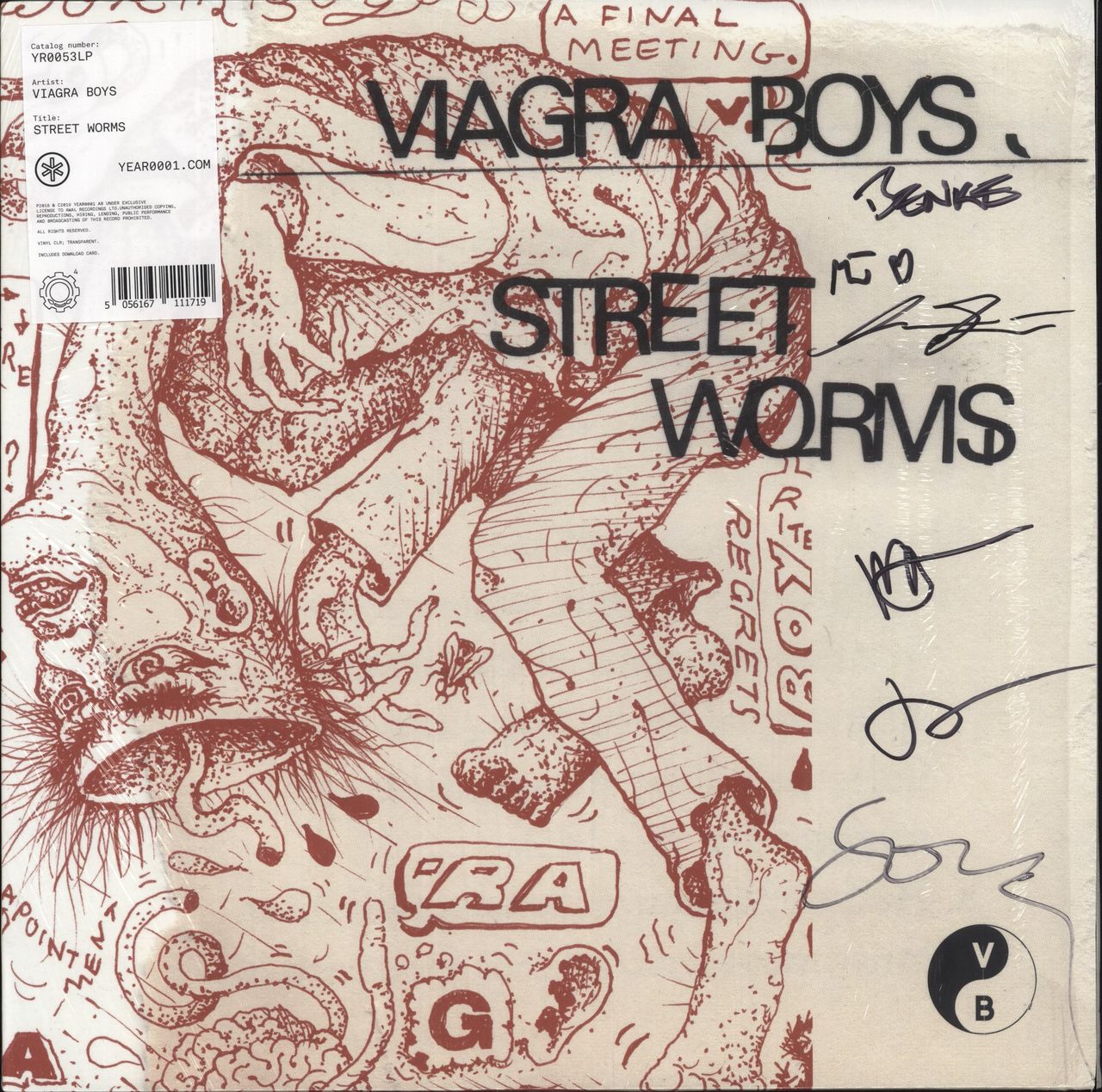 VIAGRA BOYS Street Worms (2019 Swedish 9-track LP, pressed on 180gram Clear Vinyl. 2018 debut album from the Swedish punk band. Picture sleeve with lyric insert. The sleeve remains in the open shrink with hype-sticker displays minimal wear. This Recordstore version is fully Autographed on the front in black marker pen, includes the signature of their late guitarist Benjamin Valle. The vinyl is Near Mint)